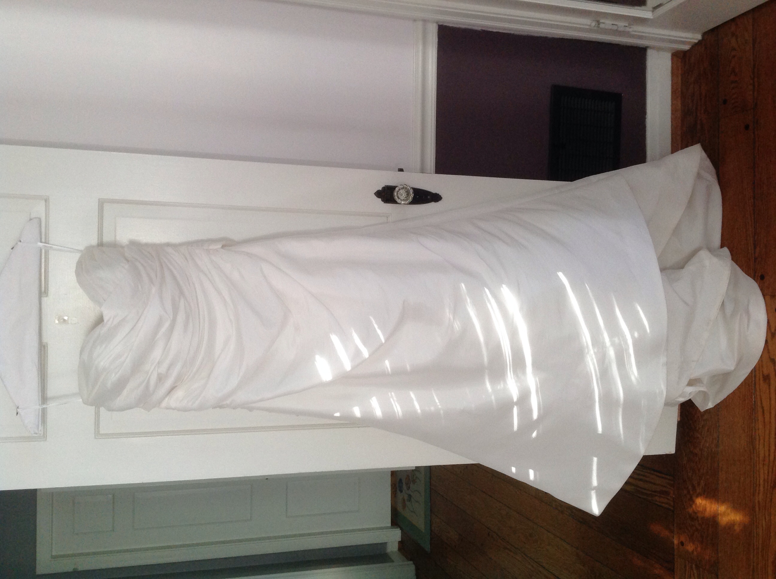DaVinci gown for sale. Size 18 ivory, rouched, sweetheart neck gown with corset back. Worn but in great condition. Some staining on underside from outdoor wedding that cleaners could not remove. Only alterations: hemmed. Worn by 5'7" bride. Paid $600. Asking $300 OBO. Also have never-worn tulle slip for sale.