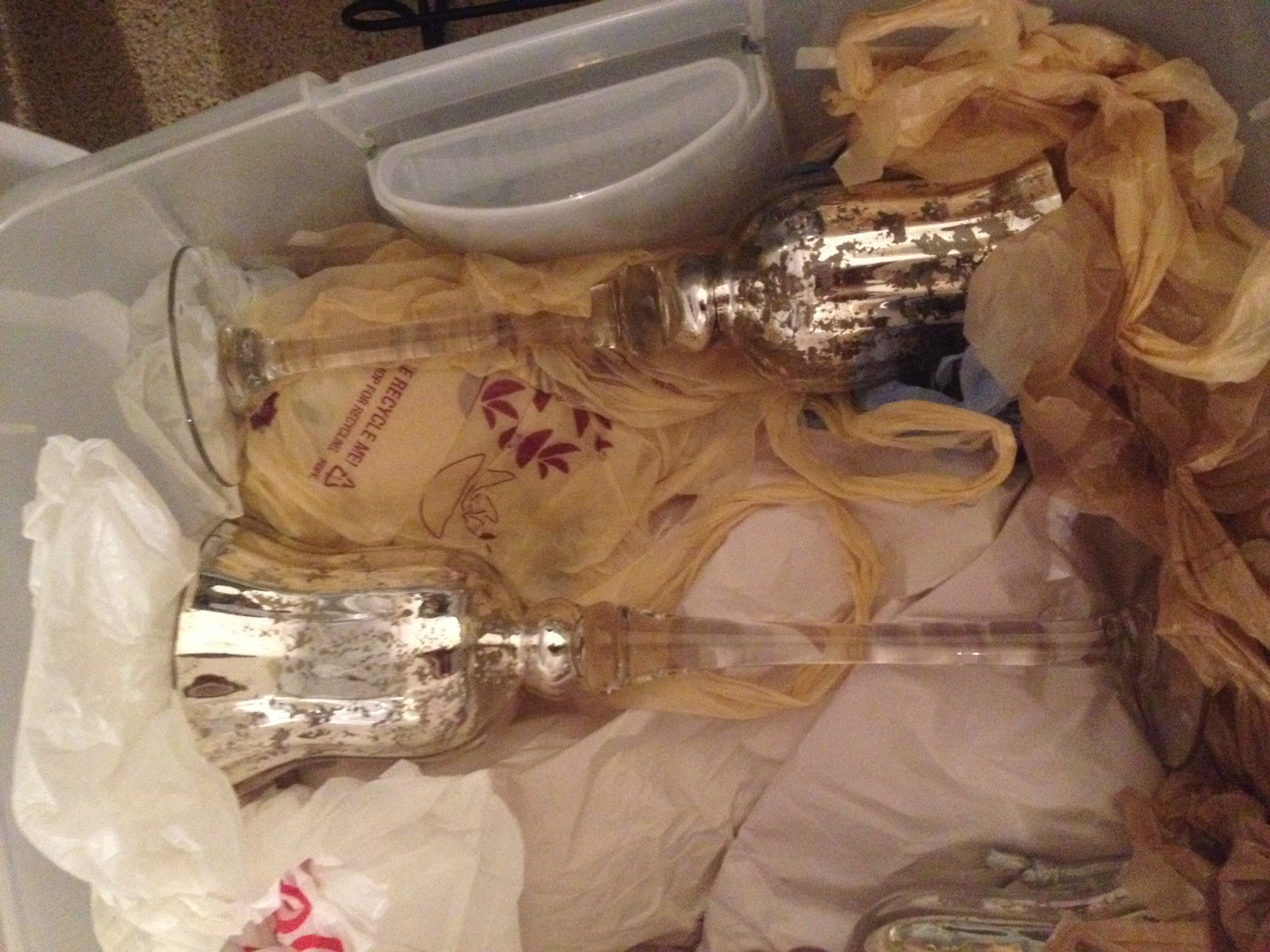 Candle sticks with mercury glass goblets (I used these for my centerpieces, no wax to clean since I used battery operated tea lights. 20 small, 21 medium, 21 large. I purchased these at Michaels if you needed more)
