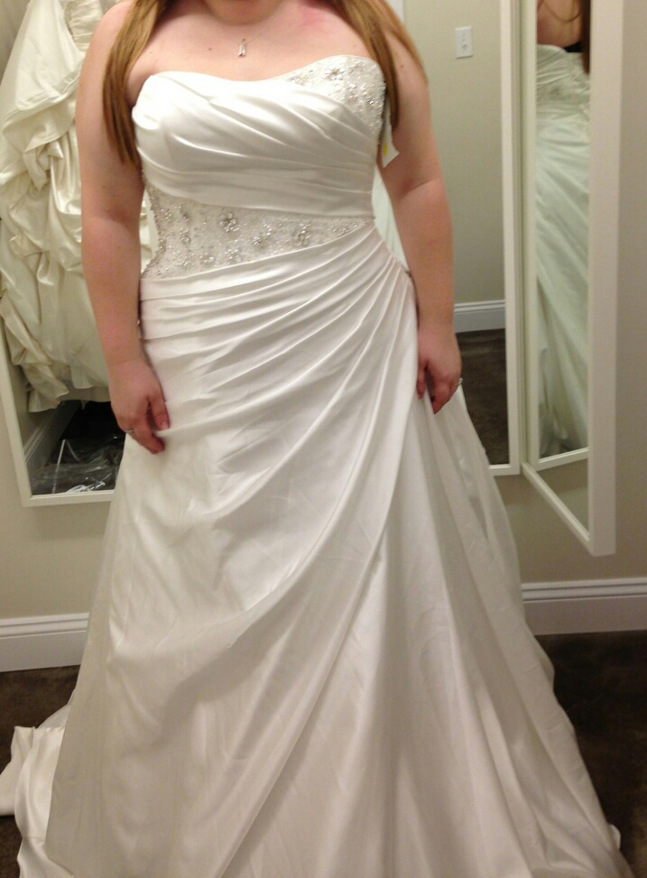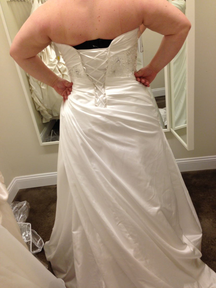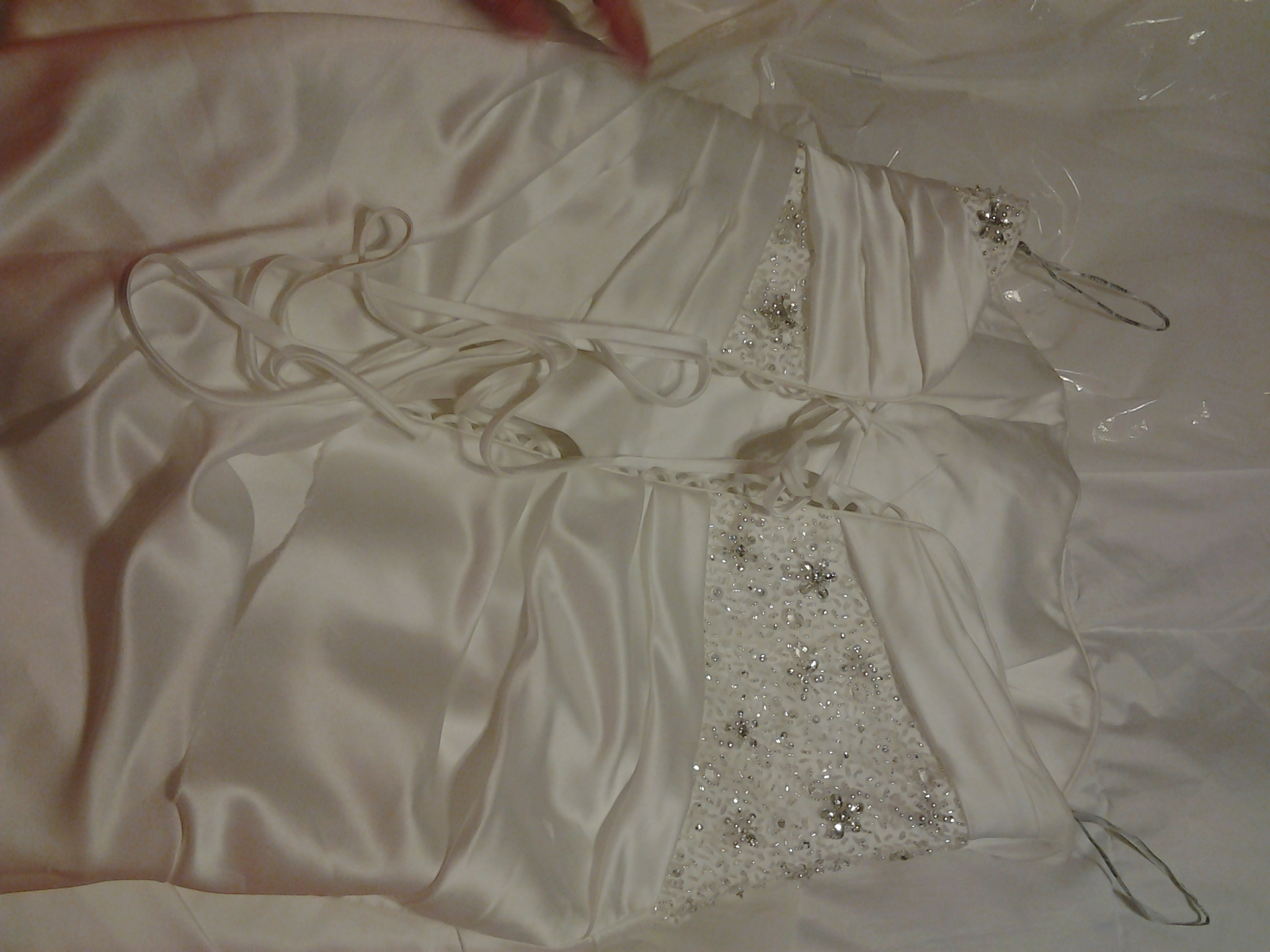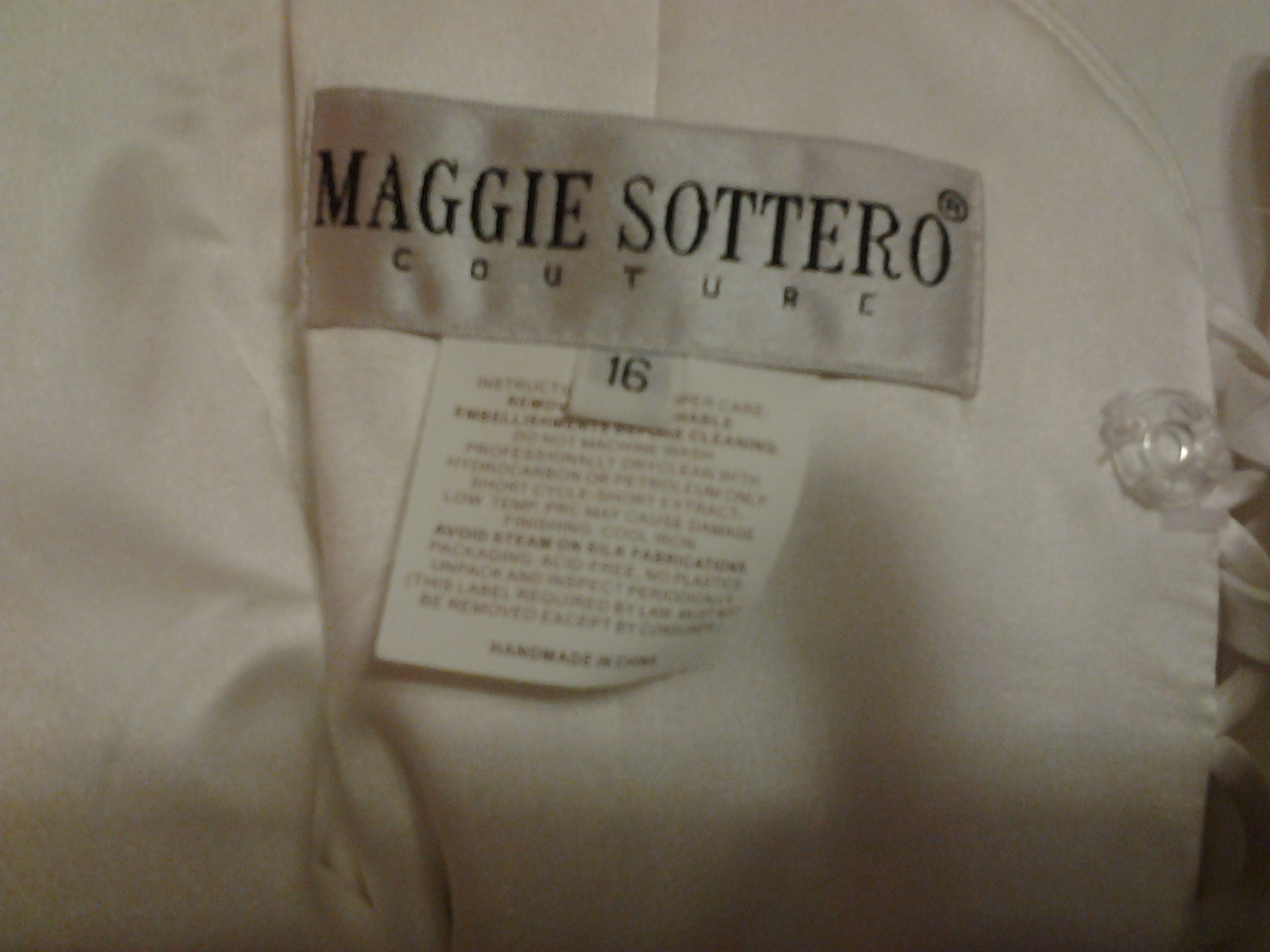 I bought this Maggie Dress and Loved it. Story of why Im selling.... I bought this dress and then MIL wanted me to go to a bridal shop with her and I fell head over heals for a different dress. I am getting married this May and have never worn this dress. It is size16 and never been altered. Has a corset back and the Only thing that you might want to replaced Is the corset tie. Absolutely nothing wrong with the dress.