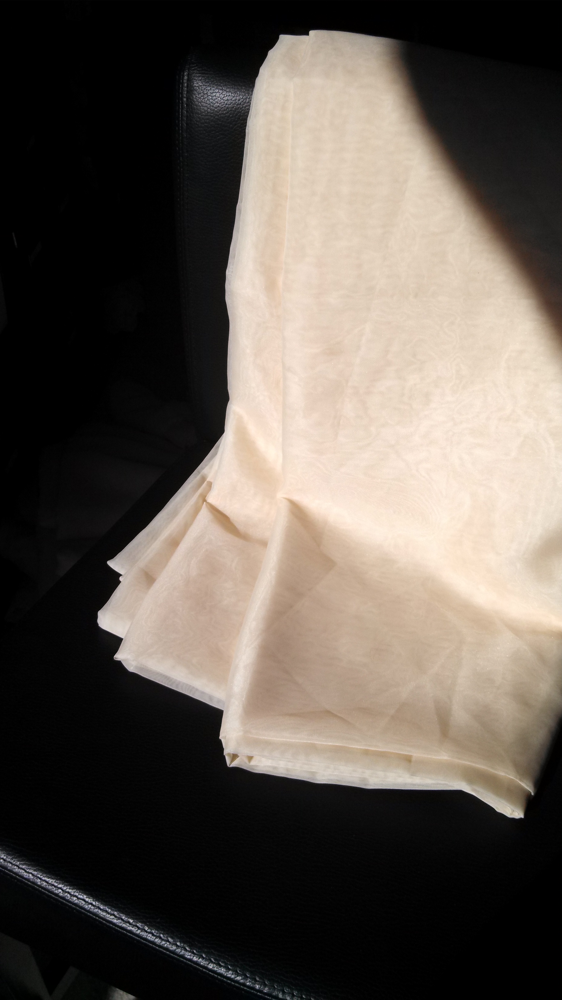 The drapes are all champagne colored and made of sheer voile, which is non-flammable, nicely reflects light, and is what professionals use when draping.