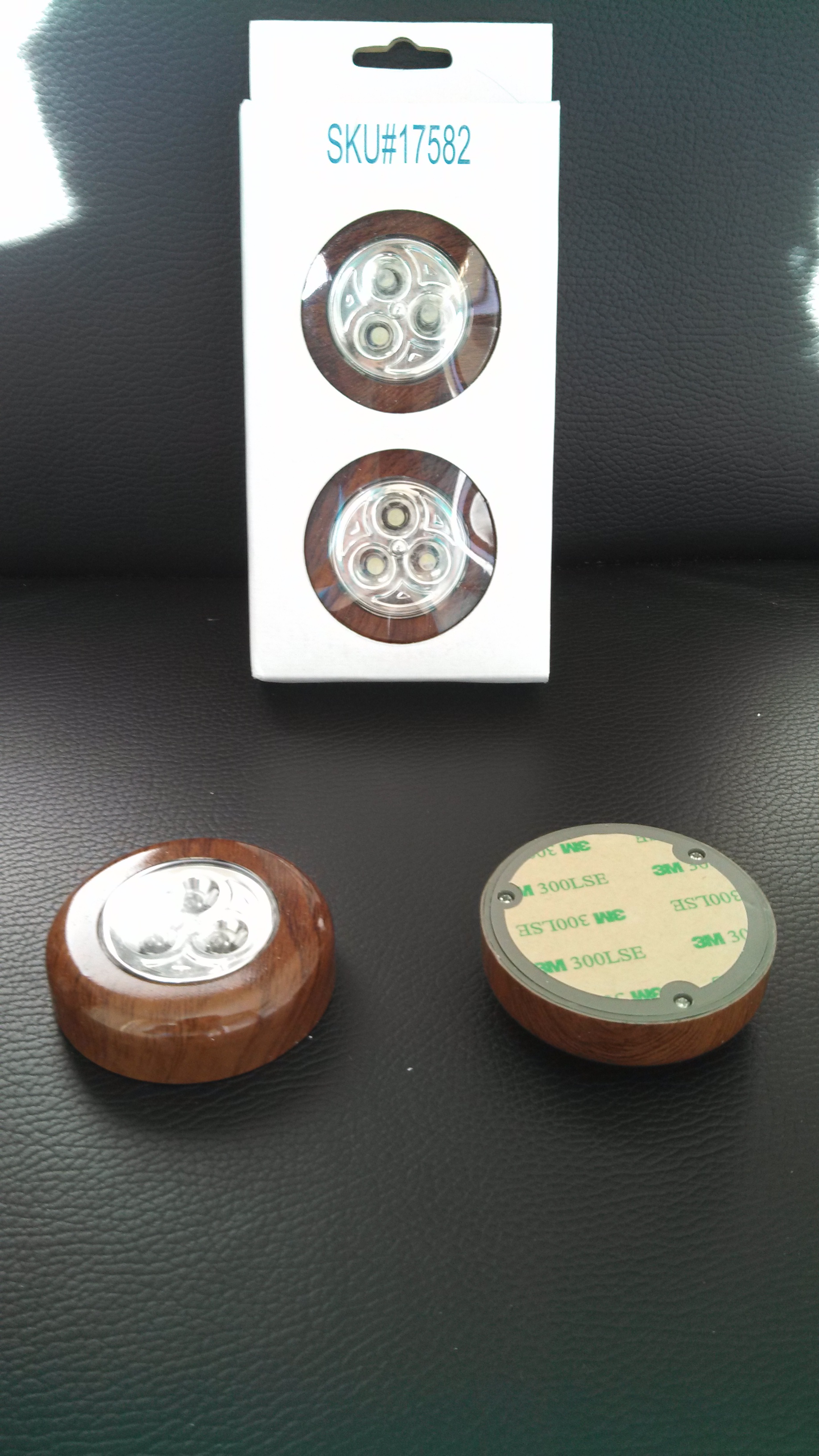 I have 19 LED puck lights that I used in my wedding to light glass vases and table numbers. They each take 3 AAA batteries, which are not included. They have a wooden design to them and all have an unused 3M sticker on the back. Paid $40, asking $20 for all or $3 each.