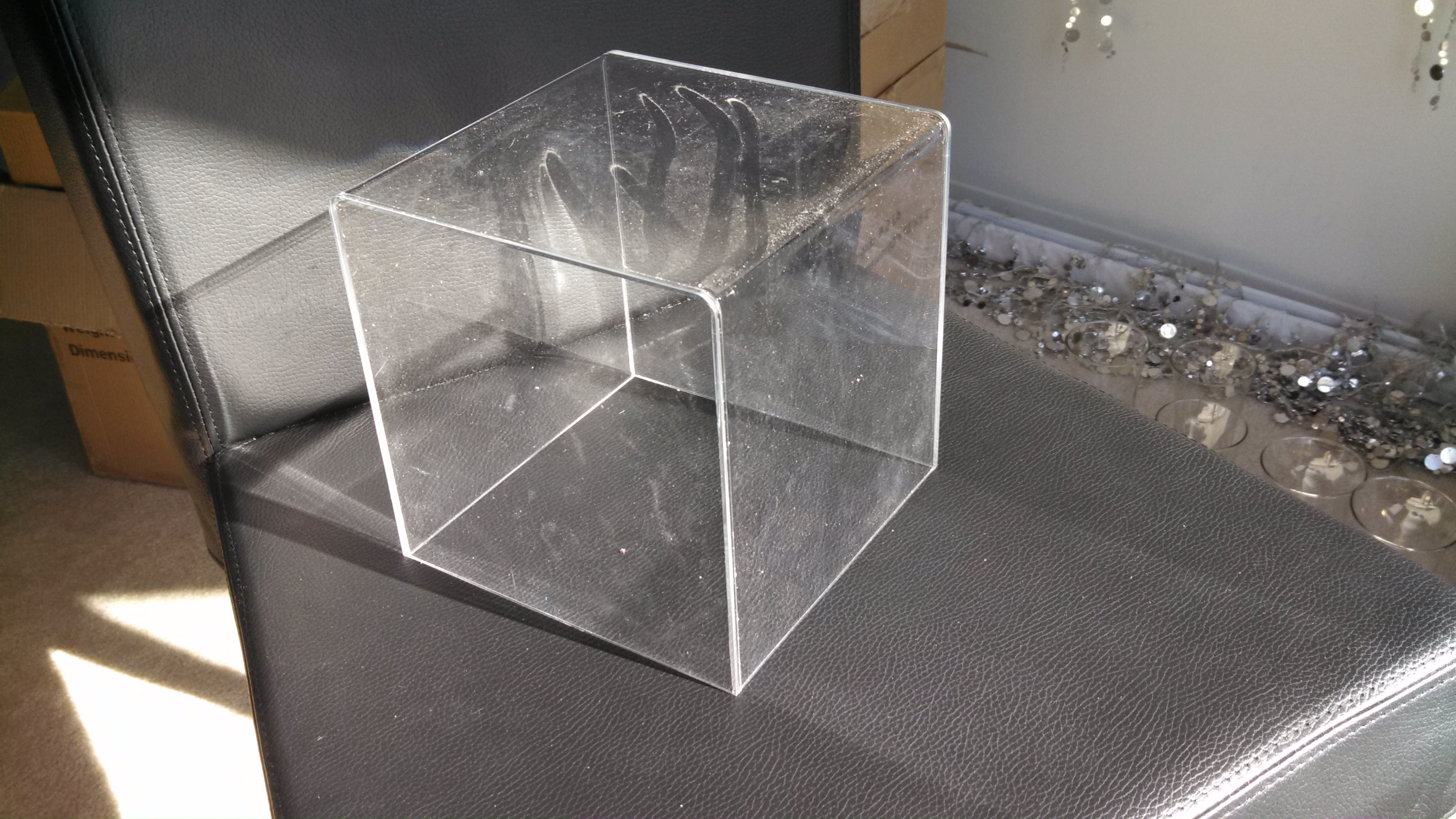I have 20 cube acrylic displays that I used for decorations for my wedding. They measure 7” x 7” x 7” and are open on the bottom.
