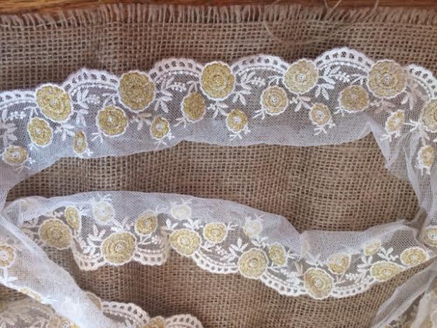 22 feet of beautiful ivory and gold flowered lace material. I used this for trim on the burlap runners I made. I also have 3 feet of burlap, 13 inches wide. $15 for all.