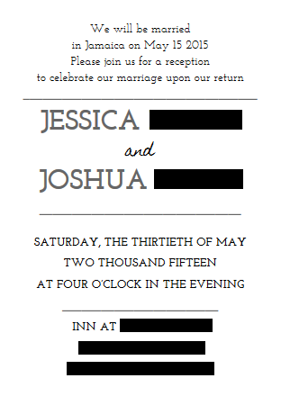Fiance and I are getting married in Jamaica May 15 2015 just the two of us. When we come back we will be having a small reception and sharing our wedding photos with our friends and family. We are having between 30-50 guests, so we are thinking we may only need about 35 invitations at most. After way to many hours of searching for invitations and realizing all of my favorites were far to expensive I have decided I am likely doing my own.