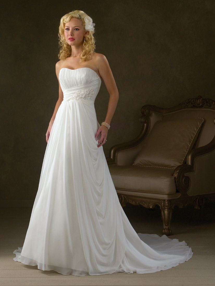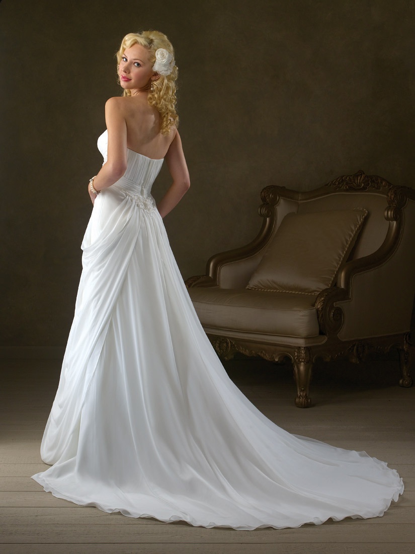 Strapless gown with ruching along the sweetheart neckline. The asymmetrical empire waist is accented by beading and floral appliques. The softly pleated skirt has a draped overlay that loops across the side to the back of the chapel train.