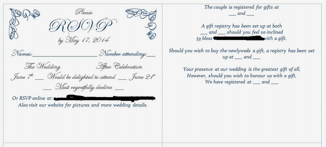 So, there are many factors involved in this problem, a tight budget, a short engagement (5 months), a long distance relationship, and so on. I need to figure out how to word the Reception and RSVP cards in my wedding invitations. Because of our long distance relationship we are having our wedding in my fiancé's home town in Alabama, I've always loved it there anyway. So, we know that most our friends from where I live won't be able to attend the wedding, and we're having a celebration/reception after our honeymoon back at my church. I also have tons of family all over the country! So I want to give everyone the option of coming to either one, or both, so I want to include all of the information in one invite. Because of the tight budget, I'm also designing and printing the invitations myself. So I wanted some outside opinions on what I've come up with. The picture attached Is the Reception card and the RSVP card. On the reception card I have information listed for both "receptions" because the first one is pretty simple. I'm not quite sure how I should word this, "For those who cannot attend, the second reception will be held on..." or "For those who cannot join us, another celebration will be held on..." or something of that sort. Then on the RSVP card, I want people to be able to tell me on one card, I will/won't be coming to the wedding and I will/won't be coming to the celebration later. I'm at a bit of a loss on how to keep nice wording for accept/decline for two different events, and fit it on one card. Does the layout I came up with make sense, to mark on the lines on either side of accept/decline for each event...or is just confusing. And lastly! Because of our short engagement, we didn't send out 'save-the-dates' and need to list our registry information somewhere in the invitations, RSVP or Reception? Wording? I have a few different wordings on the side listed that I found. Suggestions welcome!!! Thanks for your help :)