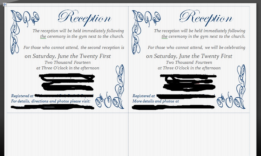 Because of the tight budget, I'm also designing and printing the invitations myself. So I wanted some outside opinions on what I've come up with. The picture attached Is the Reception card and the RSVP card. On the reception card I have information listed for both "receptions" because the first one is pretty simple. I'm not quite sure how I should word this, "For those who cannot attend, the second reception will be held on..." or "For those who cannot join us, another celebration will be held on..." or something of that sort.