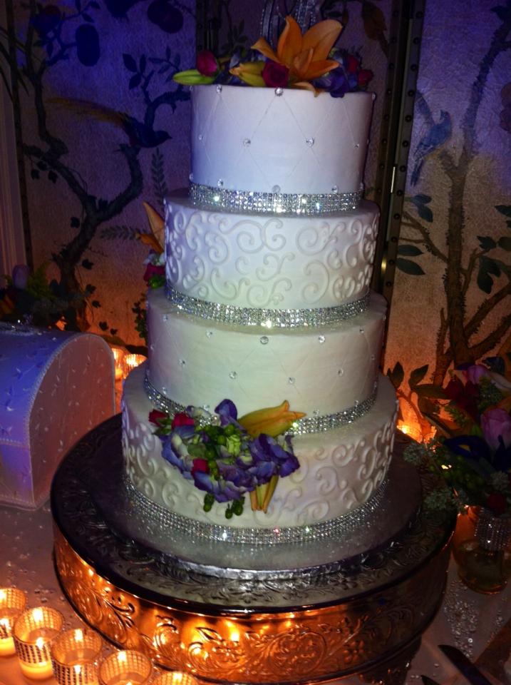 22" silver embossed cake stand-$150 Was only used once at my own wedding on 3/1/14. Attention bakers and caterers, stop renting those cake stands, one job will pay for this beautiful cake stand. Display that wedding cake in style, top on the line stand! Hosting the wedding yourself? Purchase this stand for your wedding cake, then use it later for a beautiful displays and be reminded of that wonderful day each time. The austrian crystal banding that you see on our cake as well as the crystal "B" is also for sale. The banding is $75 and is already cut for a 4 tier cake. The "B" is $75.