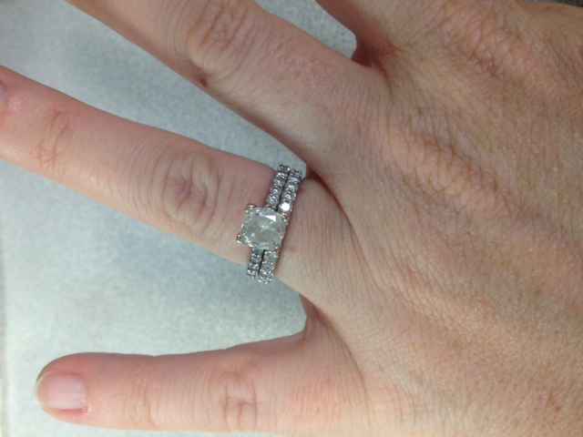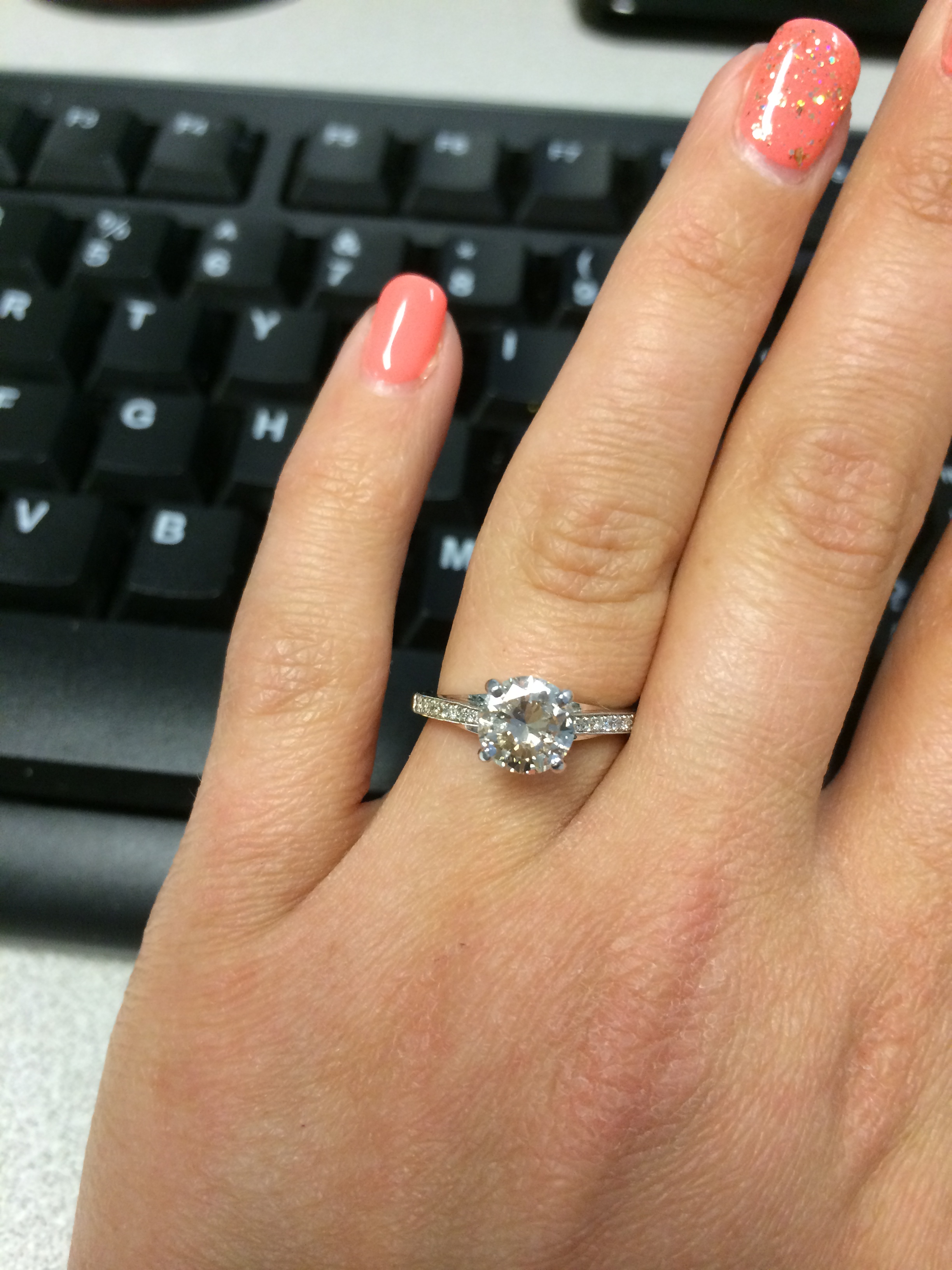 Hey ladies, I need some advice about getting a new setting for my e-ring. We got engaged in February after almost 7 years and I had chosen the setting I wanted in 2012 - we went together to try rings on. My ring is perfect for me and I love it. I have small hands and thus a thin band. Since February I have had to take my ring in twice. Once last month because I lost a small accent diamond chip. Then this past Tuesday I broke a prong and almost lost another accent chip. I work with my hands a lot as I'm in the environmental field and have been wearing a ring cozy (neoprene band) over it during any field work. Meaning, I broke the prong in my day-to-day activities. My jeweler (who is great) suggested a stronger setting with double prongs and a thicker band or a plain band altogether. I am supposed to pick up my ring tomorrow and am trying to figure out what to do. My fiancé (sorry I'm still not up on the lingo) says he understands if I choose a new setting, but would be a little sad. What to do? The pic above the keyboard is my current ring and the other is the possible alternate setting. They are VERY similar, but still not the same! I want to be able to wear my ring and not have to leave it at home! Thanks in advance!