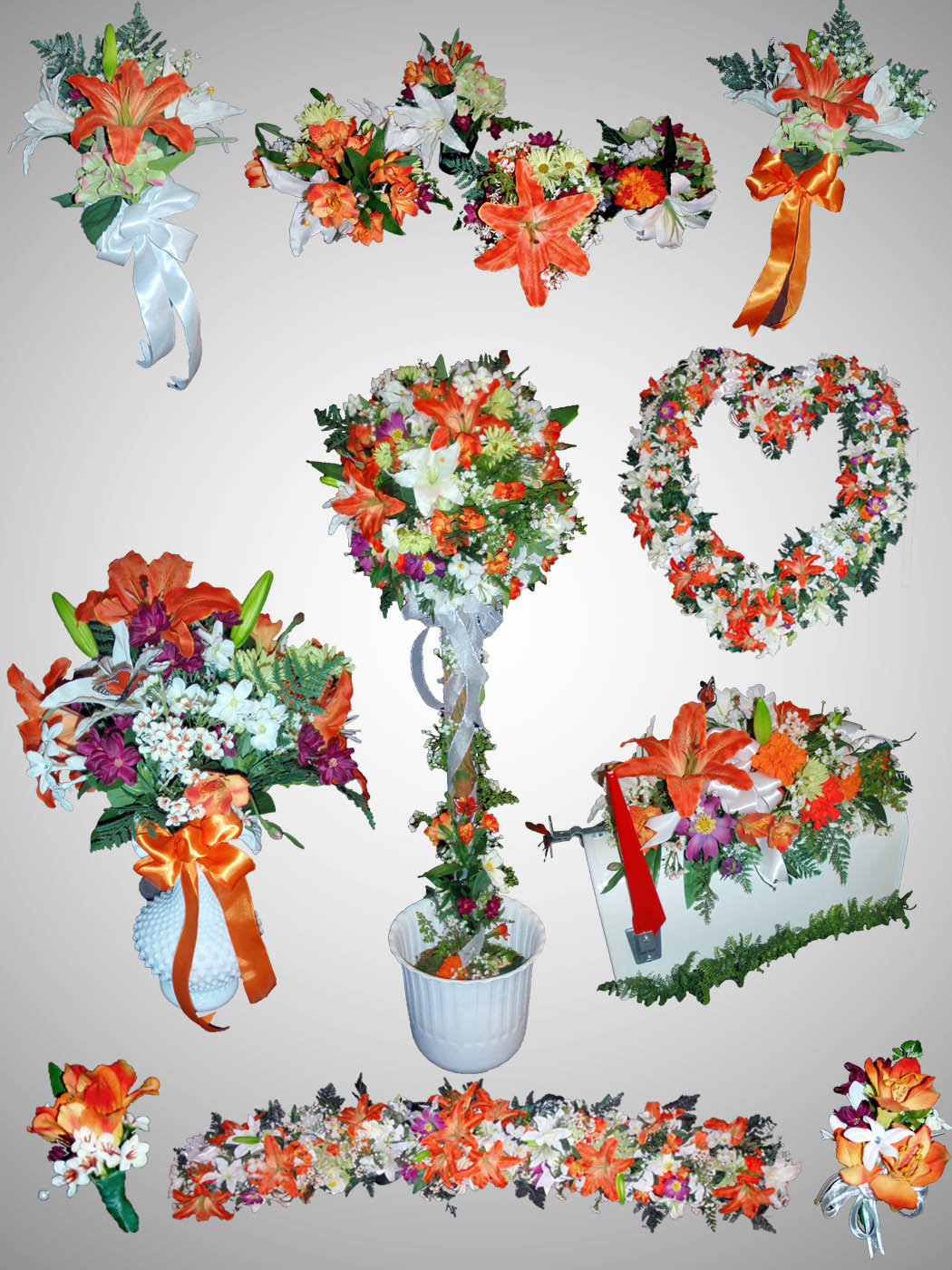Ensemble of silk floral wedding decorations consist of:
