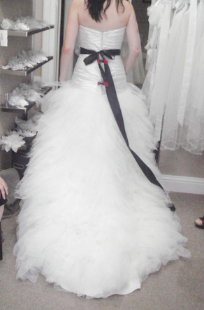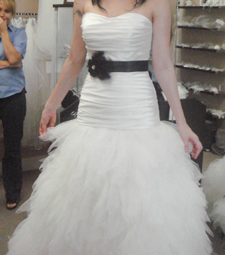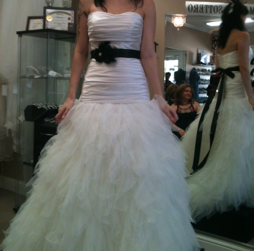 Brand new, unaltered wedding dress. Label size 10, street size 6. Dropped a-line with a slight sweetheart neckline. The black ribbon is a separate piece but will include with the dress for free. Paid $1400, asking $1100. This dress has never been worn outside of trying it on and there is nothing wrong with it.