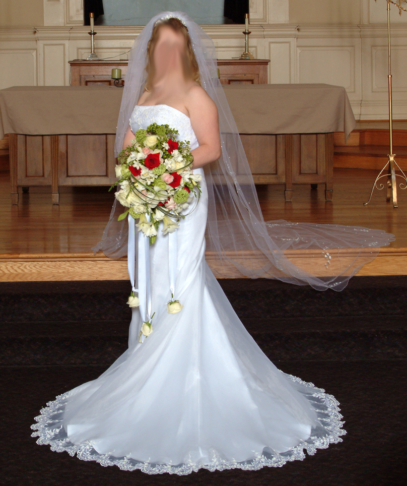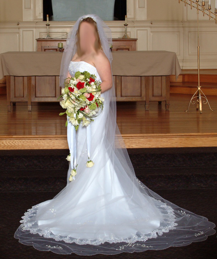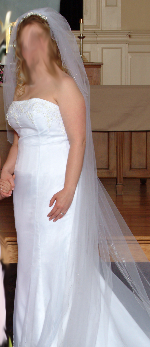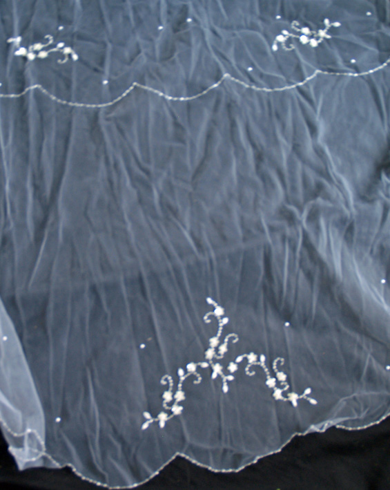 For Sale: White church/chapel length wedding veil. Has a short waist-length veil layer to cover the face. Features bead work embellishments and beads along the scalloped hems. Has a comb to set in hair (crown piece is a separate item).