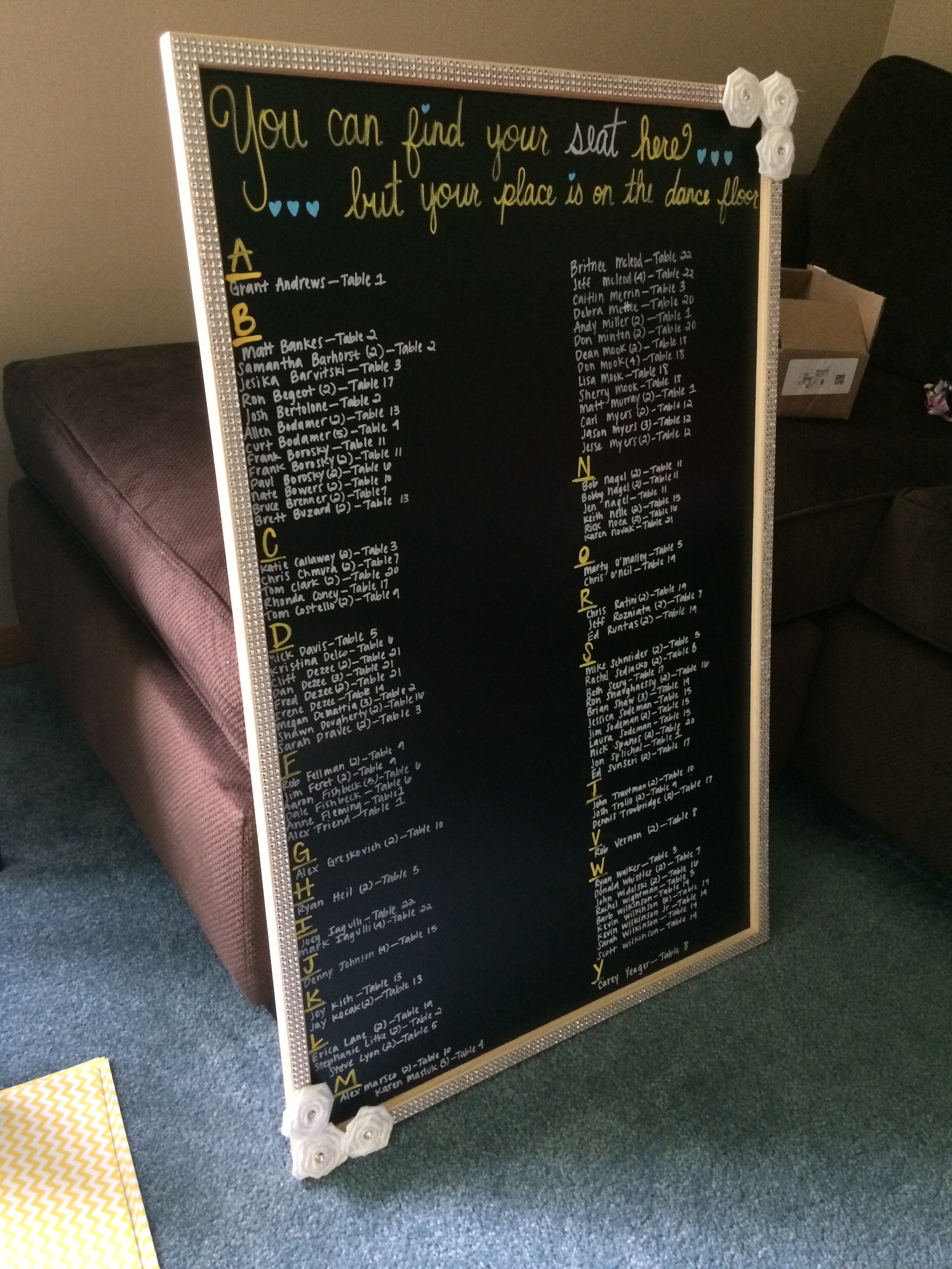 2 large chalkboards decorated with rhinestones and flowers