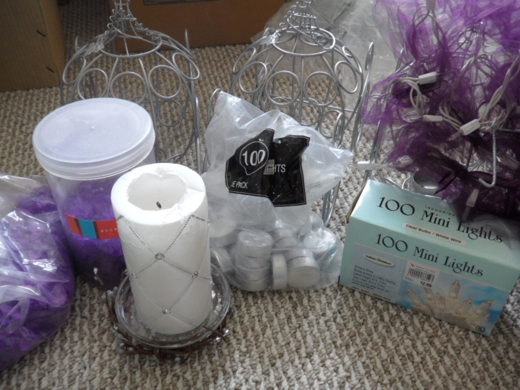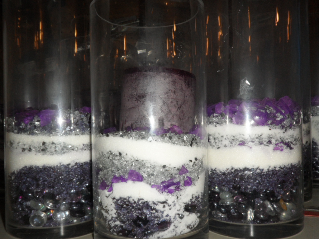 10 short vases with filling and eggplant candles - $12 each