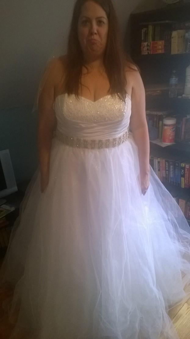 ANYWAY when we get back home, MOH suggested that I put on my dress with all of my accessories to cheer me up. And it did!!!! I've tried on the dress before but not with the accessories. The dress I ordered through Etsy that someone on here helped me pick out I was kind of on the fence about, but now with the dress I love it, here are some pictures. I'm frowning the picture because I was HOT. I couldn't imagine wearing a wedding dress in the middle of summer!