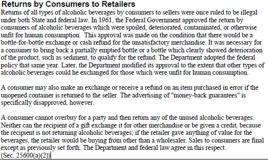 The only exception is that retailers can take returns on bottles of booze that are "unfit for human consumption". But usually a bottle has to be opened to know it's unfit, right? Anyway, I think this is why lower level peeps at retailers get confused. They'll see a manager accept a return on spoiled bottle of wine, and then wrongly tell a customer they can return unopened bottles after a party or wedding. Just wanted to put this out there so people know it's risky to rely on it!