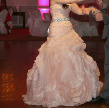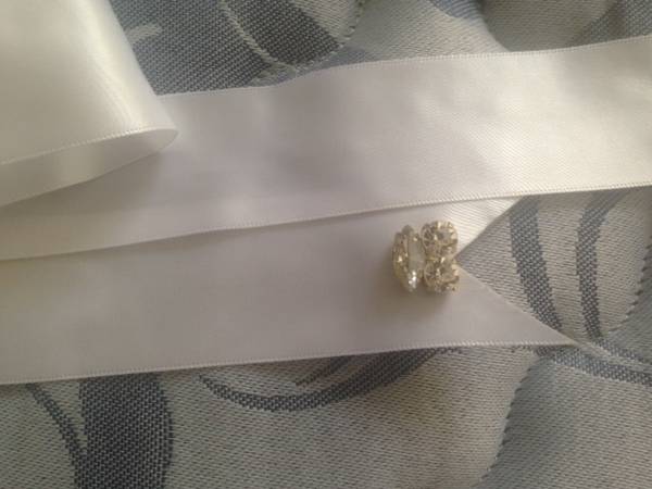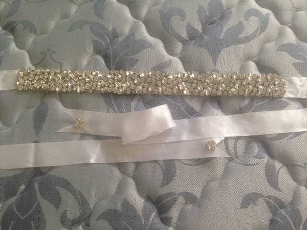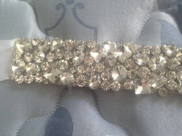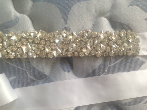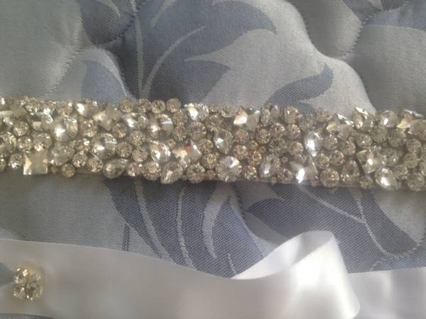 Beautiful couture, handmade rhinestone sash/belt with white ribbon for sale for $100. The rhinestone section is 18 inches in length, and the width is 1-1/2 inches. Double-faced satin ribbon, 1-1/2 inches in width, 3 yards total length. It features large and small premium rhinestones, and all are in prong settings. Contact by email at: sandrad348@gmail.com