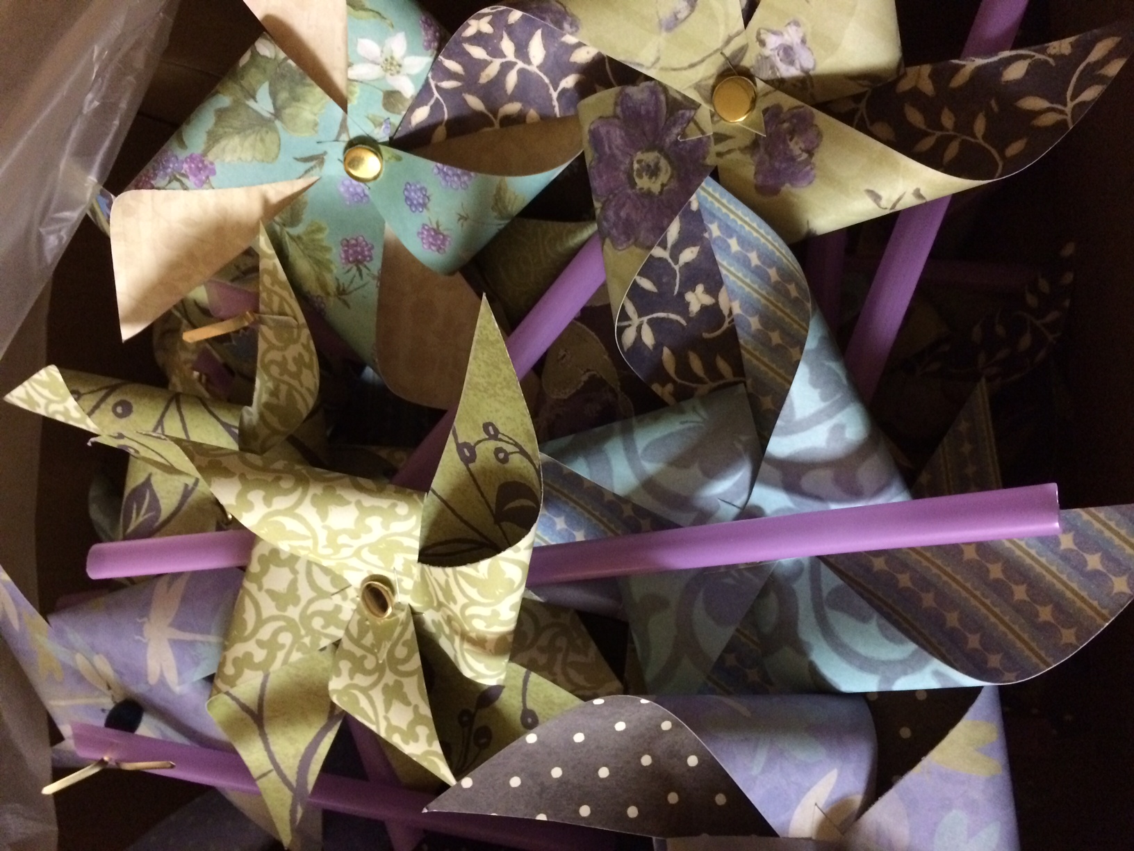 I have about 55 handmade pinwheels in different colors for sale. We used them during our recessional at the ceremony; we also put some in small vases for decoration at my shower and at the card and cake tables. The paper is mostly shades of greens, blues, grays and purples; all of the handles are purple. I would love to see them go to a good home. Contact me if you are interested at kaspilk86@gmail.com.