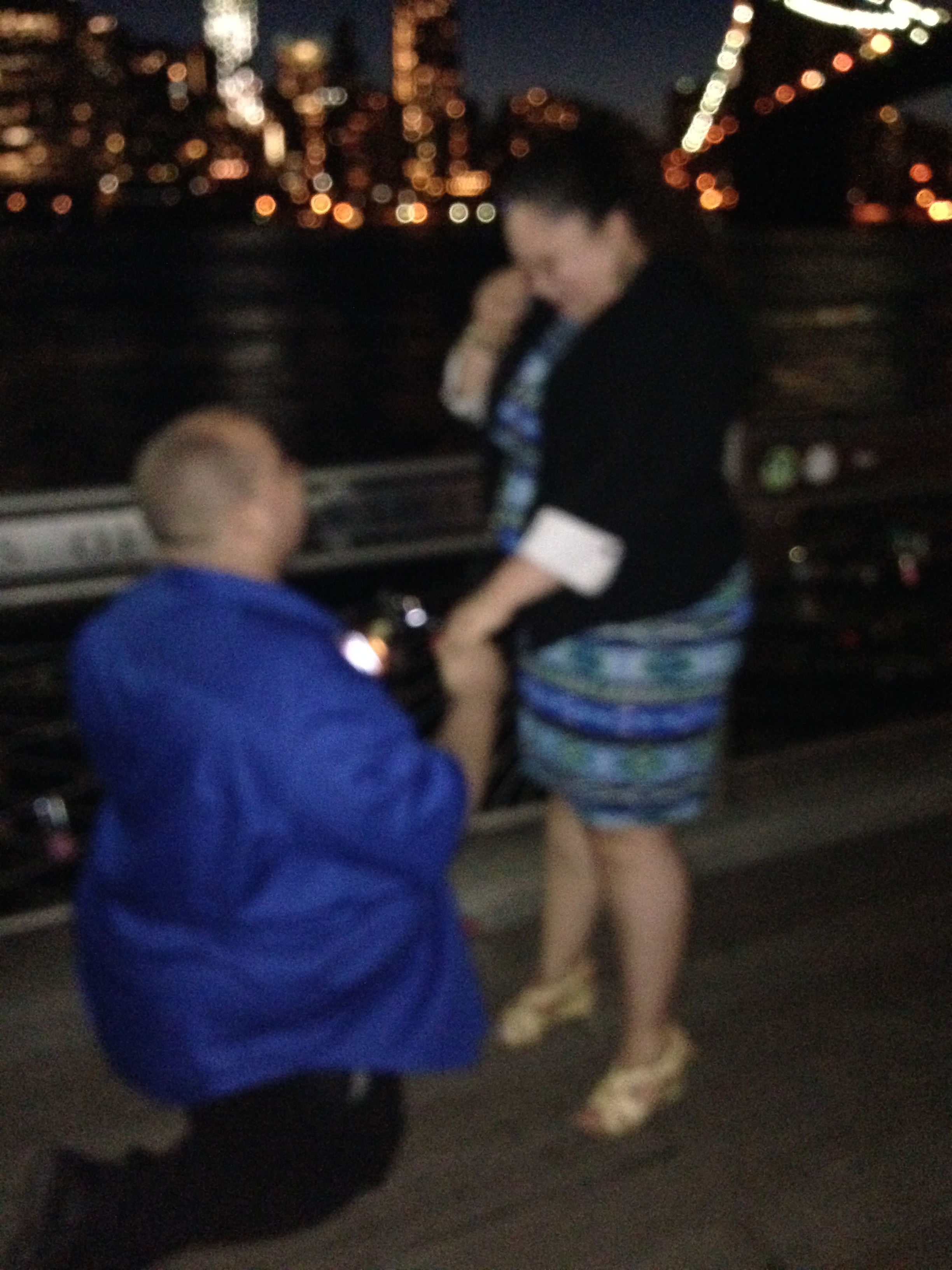 On June 11, 2014 He took me to Dumbo Pier in Brooklyn over looking city and Hudson river. he put a lock on the gate and proposal with the ring on lock. it was best day of my life. now we are getting marry on june 11,2016