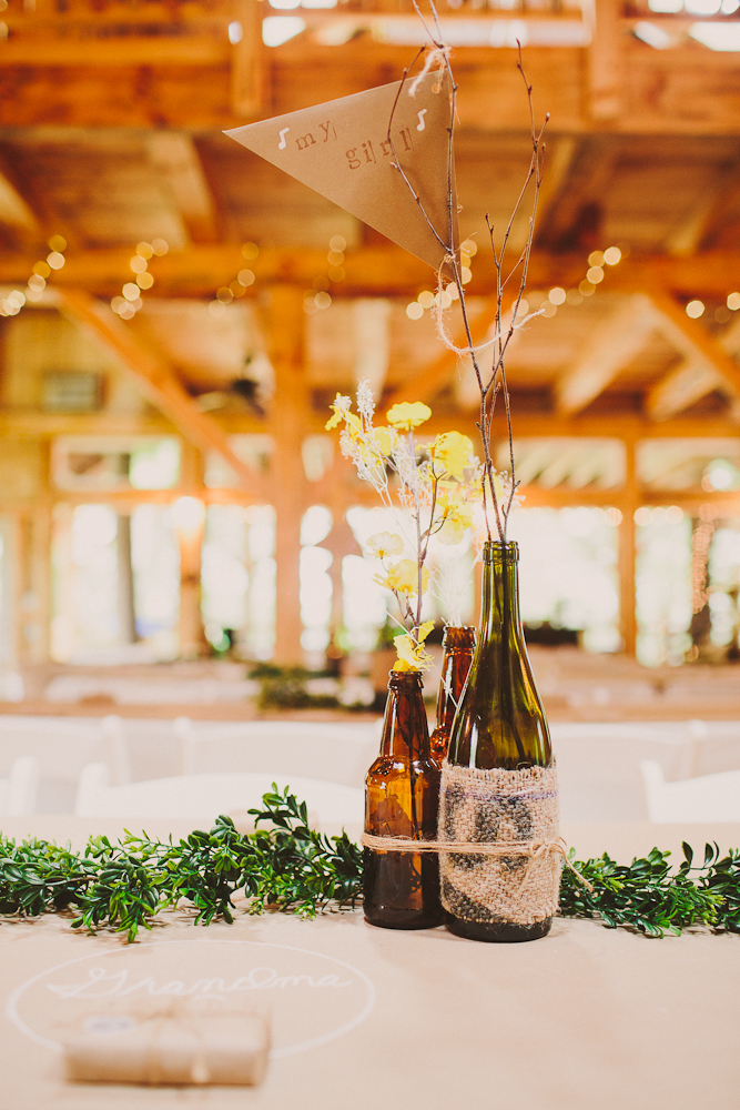 These are handmade! We scrubbed all the labels off of various green and brown beer and wine bottles then grouped them in 3s, added the burlap and tied them together with some twine!