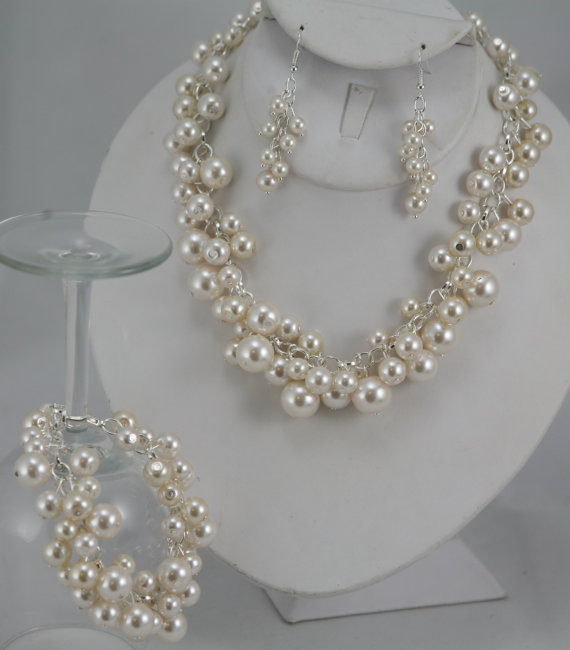 Bright silver chain and white or ivory/cream glass pearls. Comes as a set with Necklace and bracelet. (earrings not included- but can be added if needed) Necklace and Bracelet have never been worn. My husband surprised me with a pearl necklace on my wedding day which I ended up wearing instead. $40 plus shipping. contact lisa.leblanc@hotmail.com