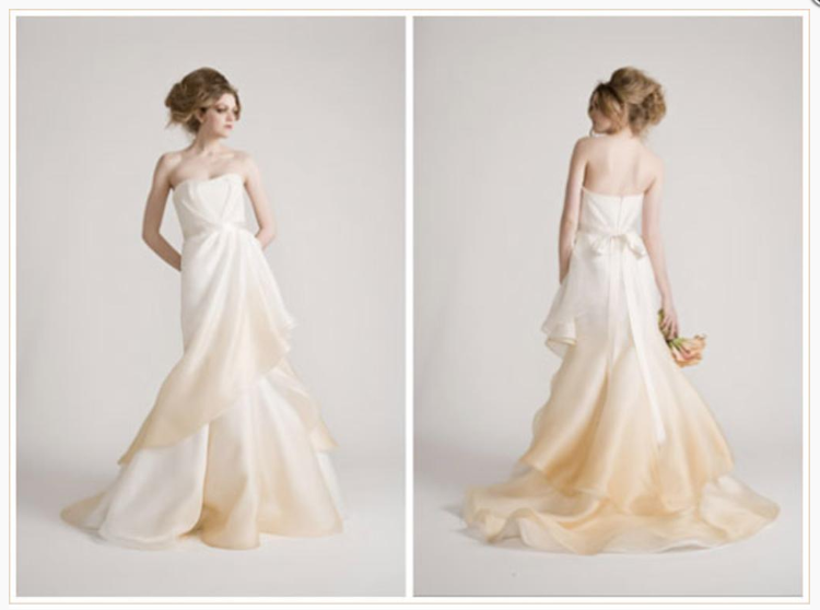 Silk organza, A line, hand dyed ombre effect, starting as ivory at the sweetheart neckline and changing to a gold / champagne at the hem.