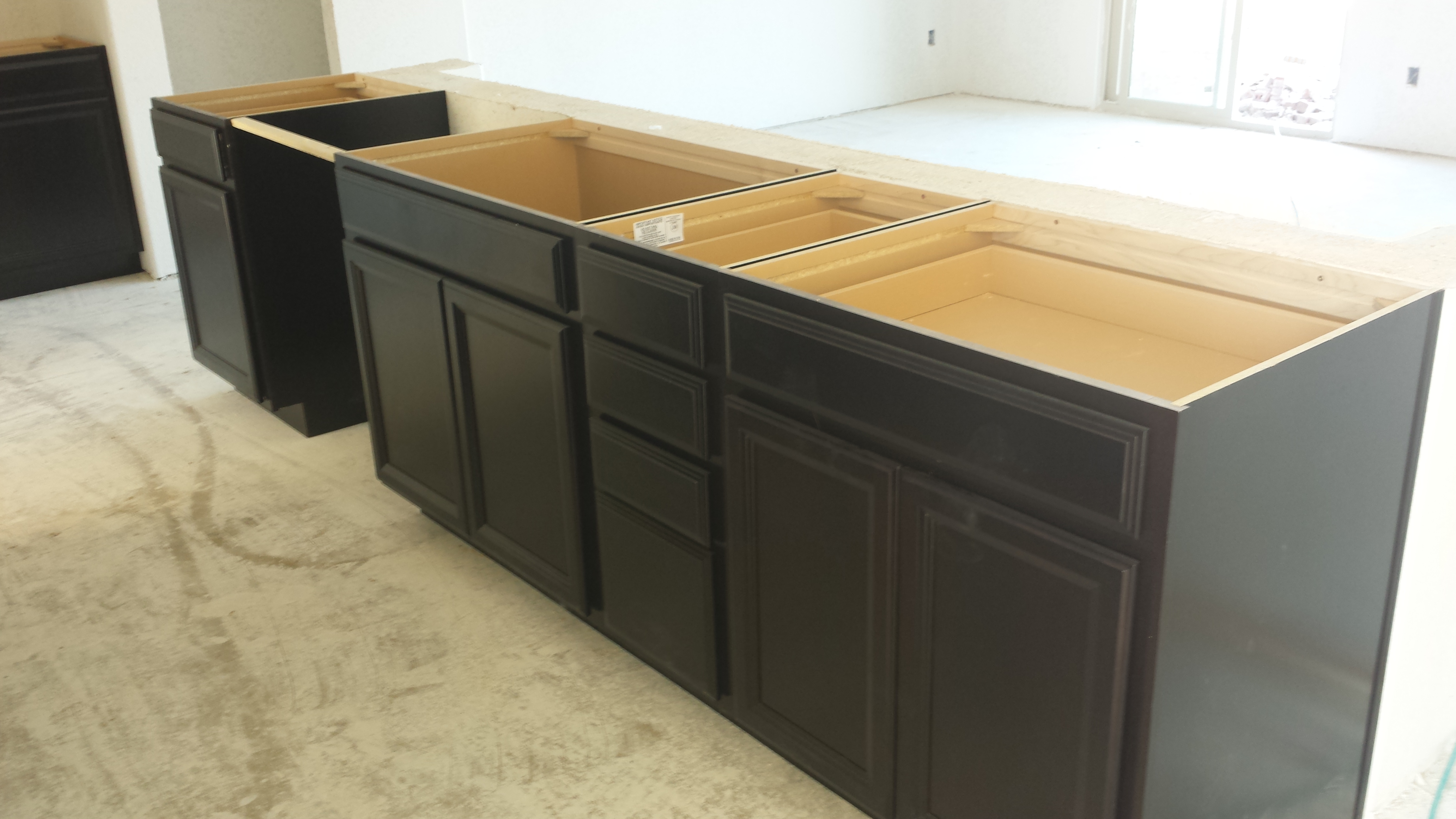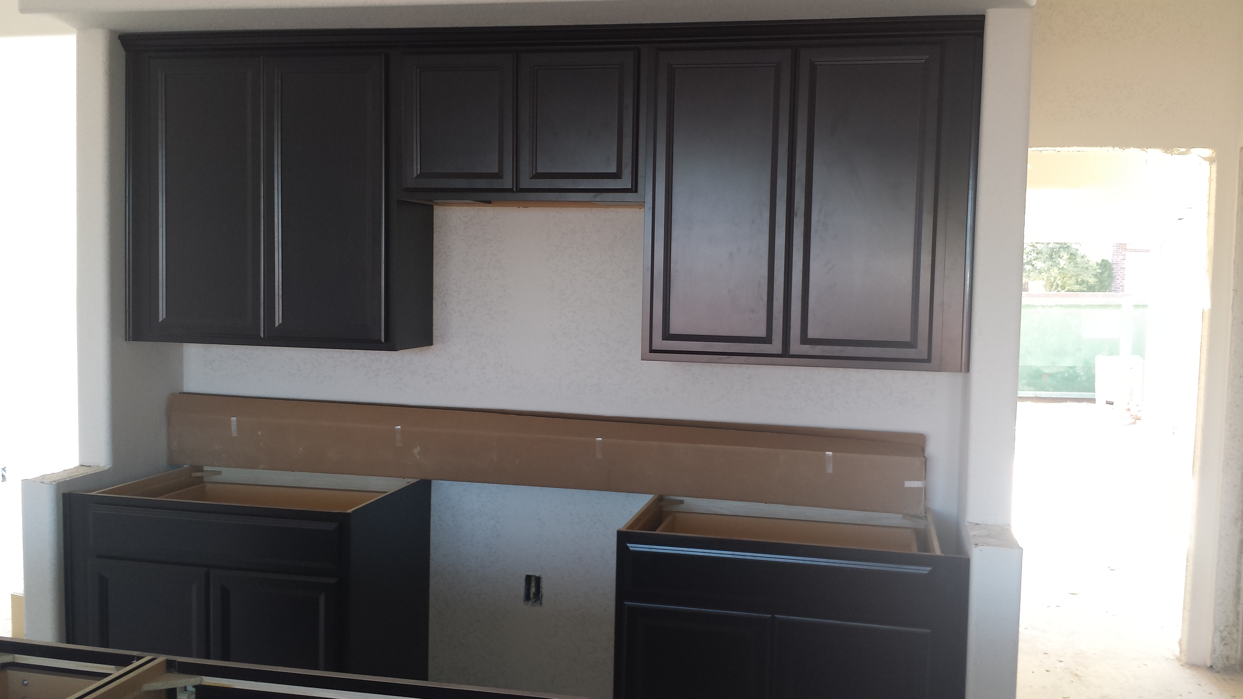 • Kitchen cabinets! They are the same in the bathrooms. ETA: we are going to choose our own hardware to put on the cabinets. I don't think the silver vertical bar handle will look good on these? I don't like plain round knobs though.