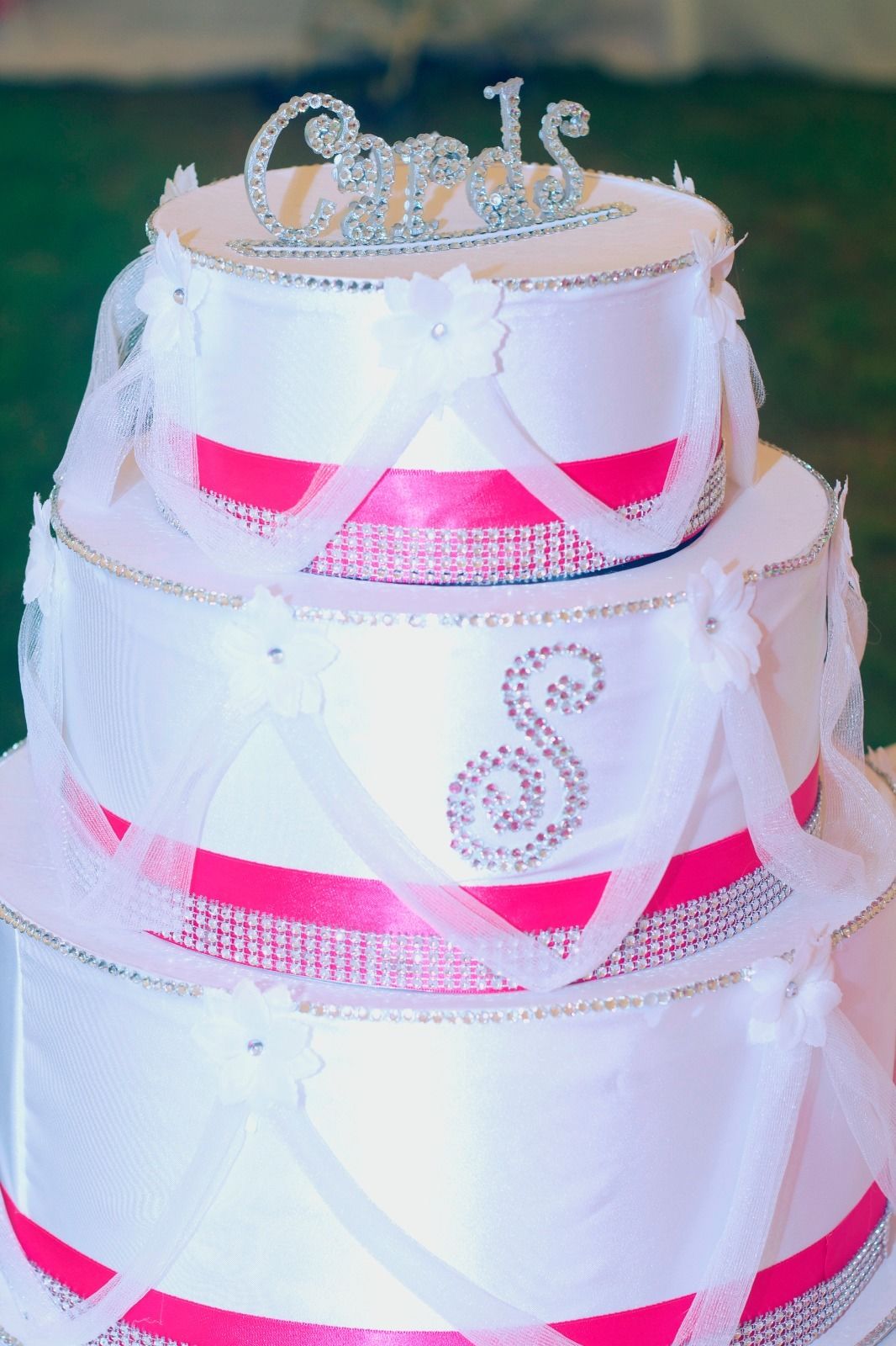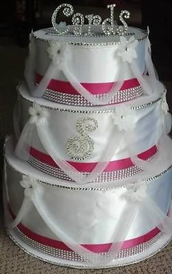 $40.00 with free shipping. White card box with pink ribbon and bling. It was used once for my wedding. Please be aware before buying that since it was a DIY project, it is not 100% perfect and has a bit of glue residue in a couple spots and a bit of wear at the edges and on the top of each layer that isn't covered in fabric. It looks like a bit of water may have gotten on on spot (the outline of it is mostly inside and a very small part of the bottom layer which isn't very noticeable). The S in front could probably be removed if not wanted on there (but not completely certain as I have not tried it). If the bling around the edges or the letters on top should fall off during shipping (they can be touchy if bumped just right), they are very quick and easy to glue back into place. I am also including what is left of the bling in case any on the letters or box should go missing.