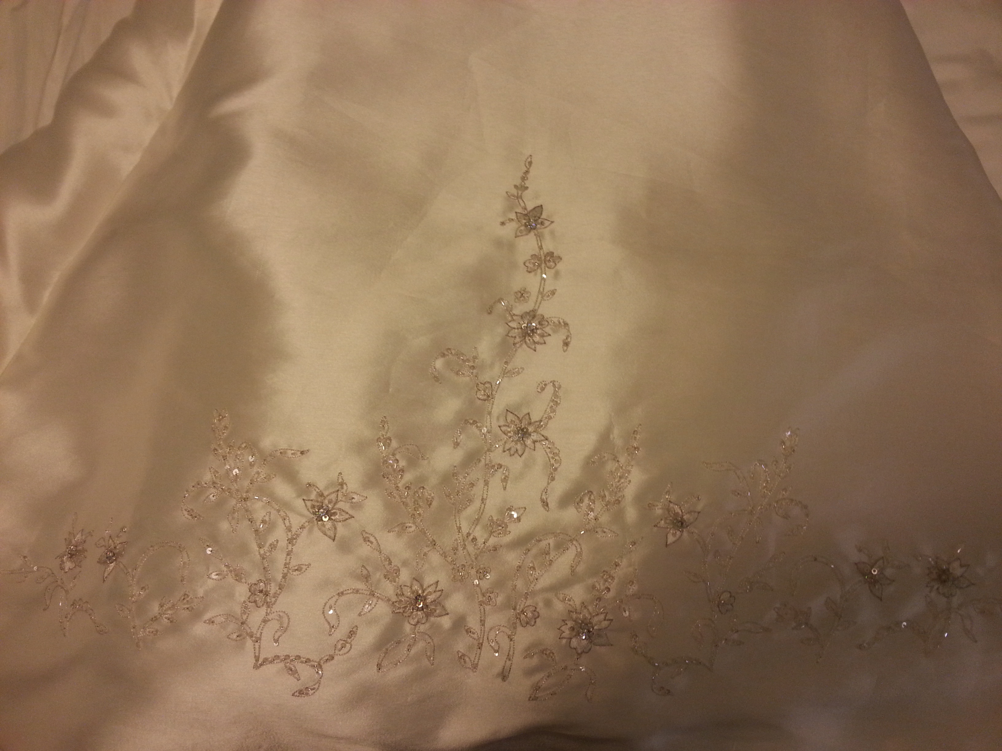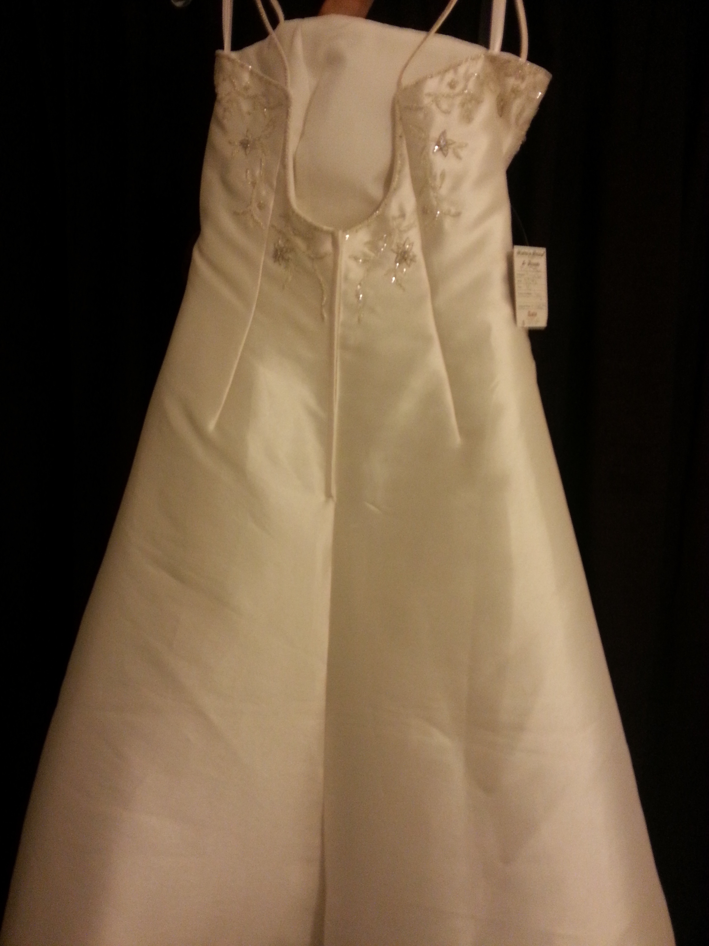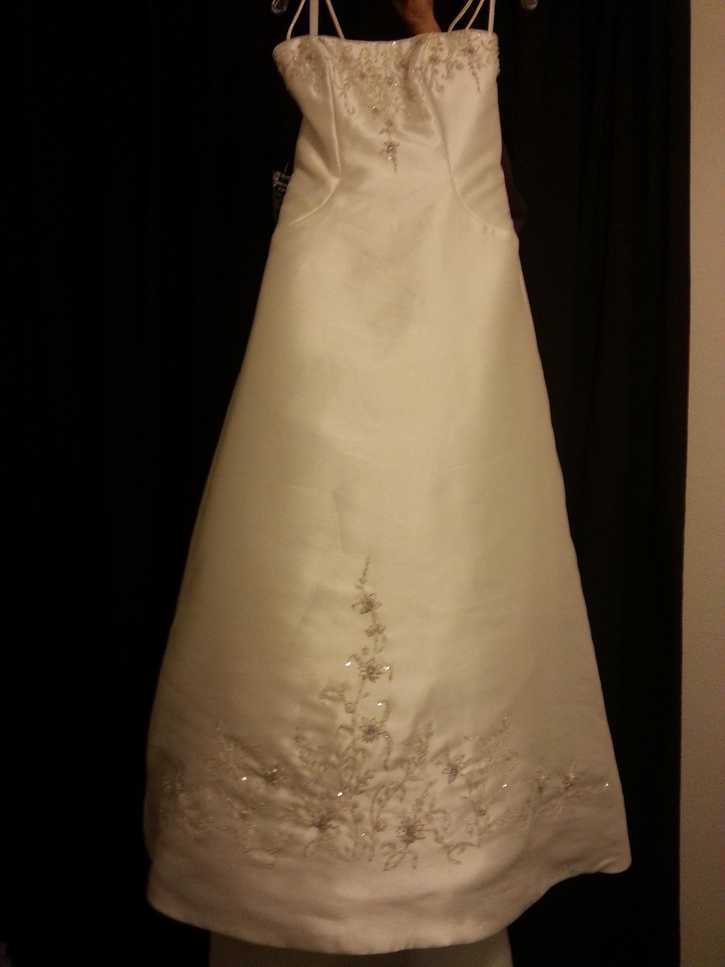 I have a beautiful new never been worn wedding dress for sale! It is an A-line dress with a straight neckline and spaghetti straps in Ivory with beadwork on the top and bottom, size 10. It is originally priced at $1,200 however, I will sell it for $199 (negotiable). Attached are pictures of the front, back and bottom of the back/train. Please send me your email address if interested!