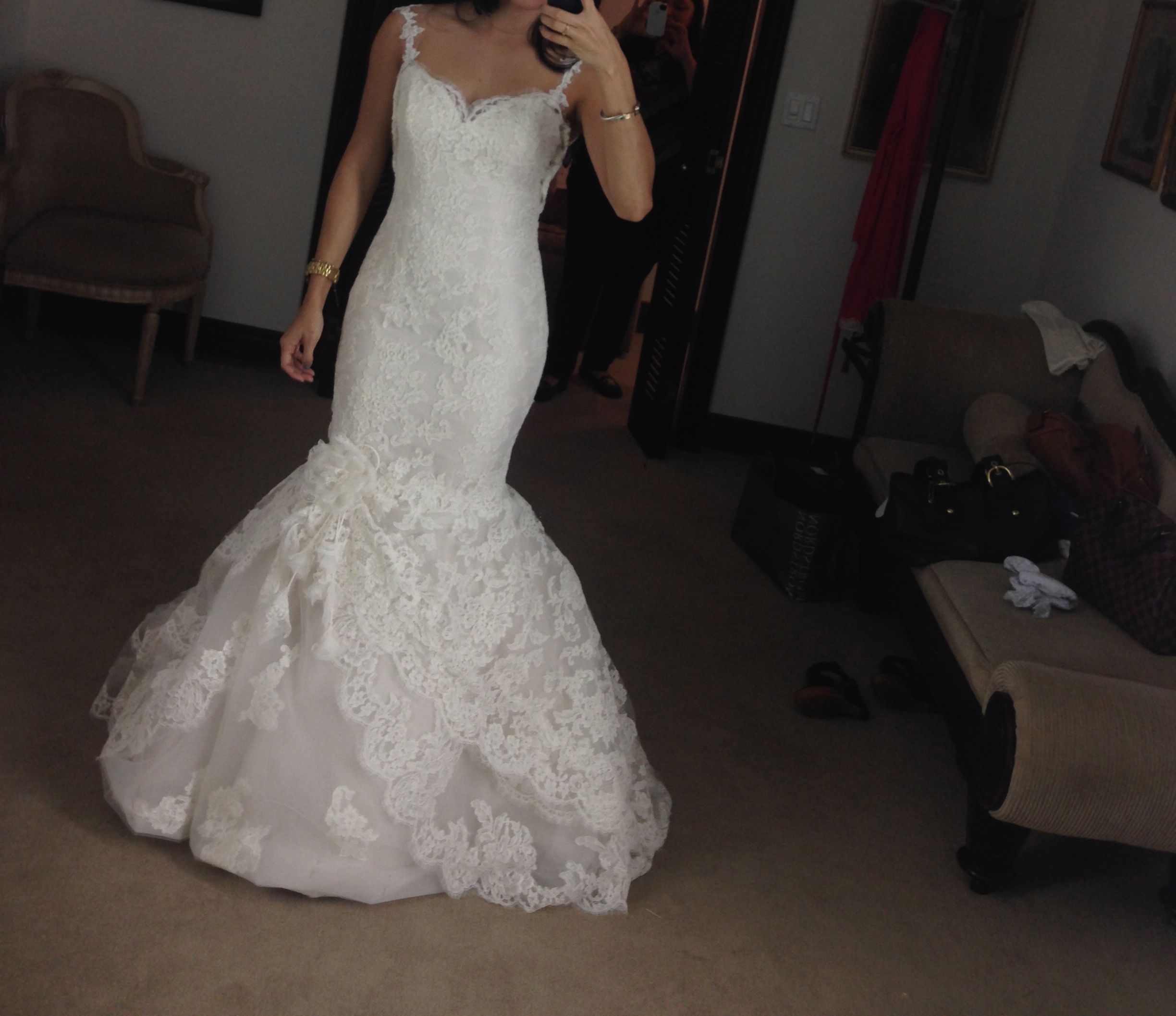 I am selling my like new designer wedding dress. It is a stunning mermaid style dress with a low back with lace details. The dress is not only stunning, it fits beautifully and is made beautifully. It is a label size 6 and a street size 2. I am 5'3 but I wore 5 inch heels making me 5'8. The only alterations made to the dress were cups that we added so I did not have to wear a bra. I sent the dress to get professionally cleaned so it is like new. If you have any questions about measurements please email me directly at josyhighpear@gmail.com