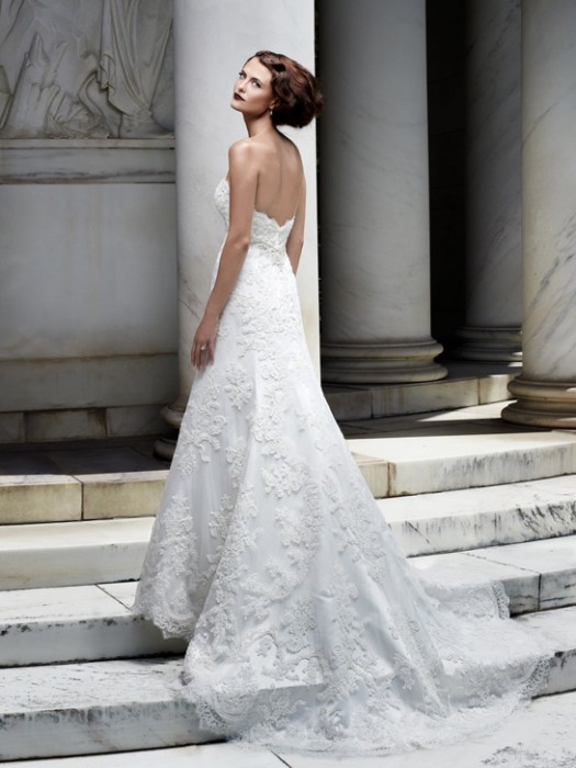 Description from Casablanca:Beautiful scalloped A-line gown with beaded band accent at waist. The beaded lace over Silky Satin is finished with eyelash fringe.