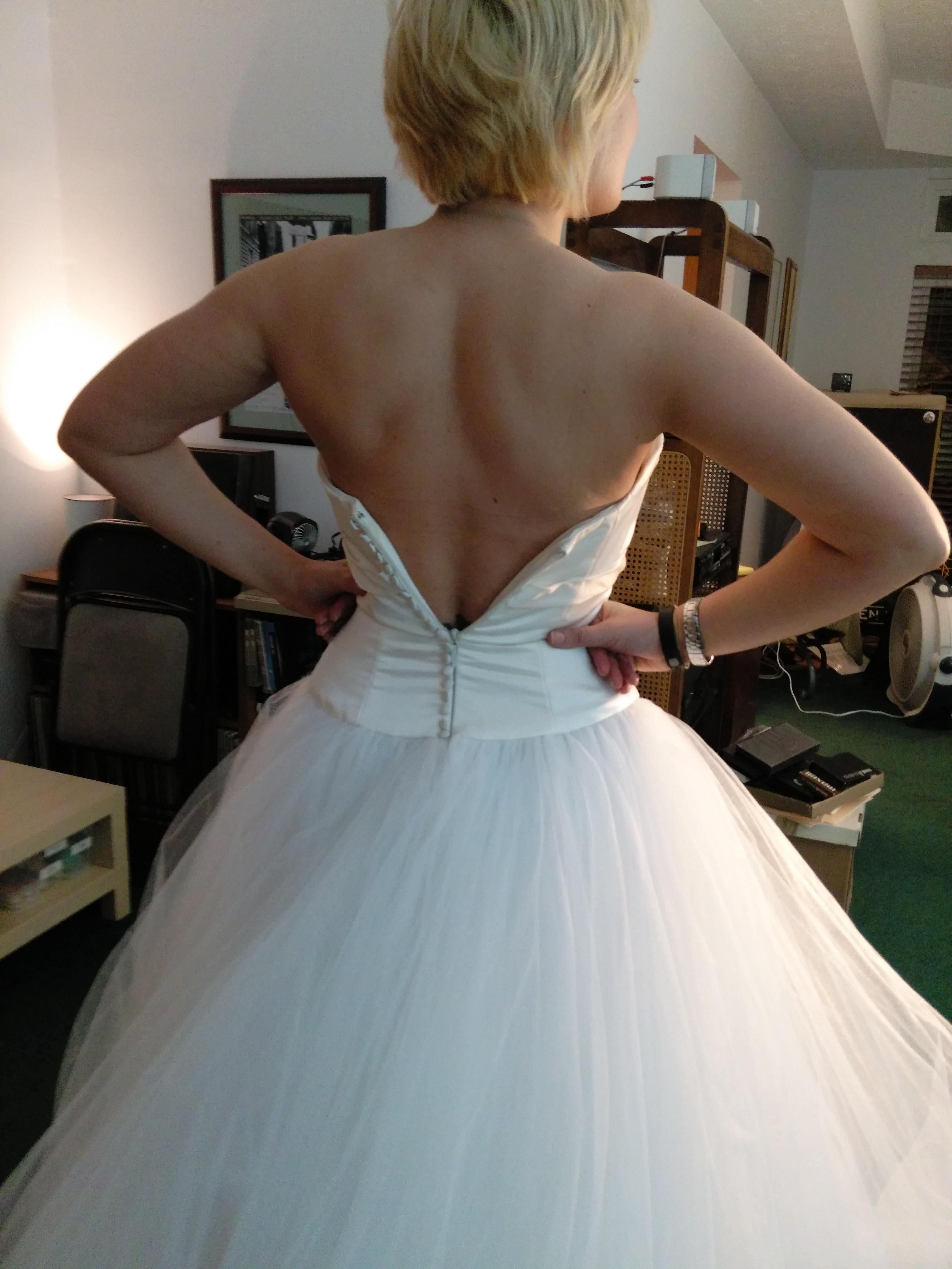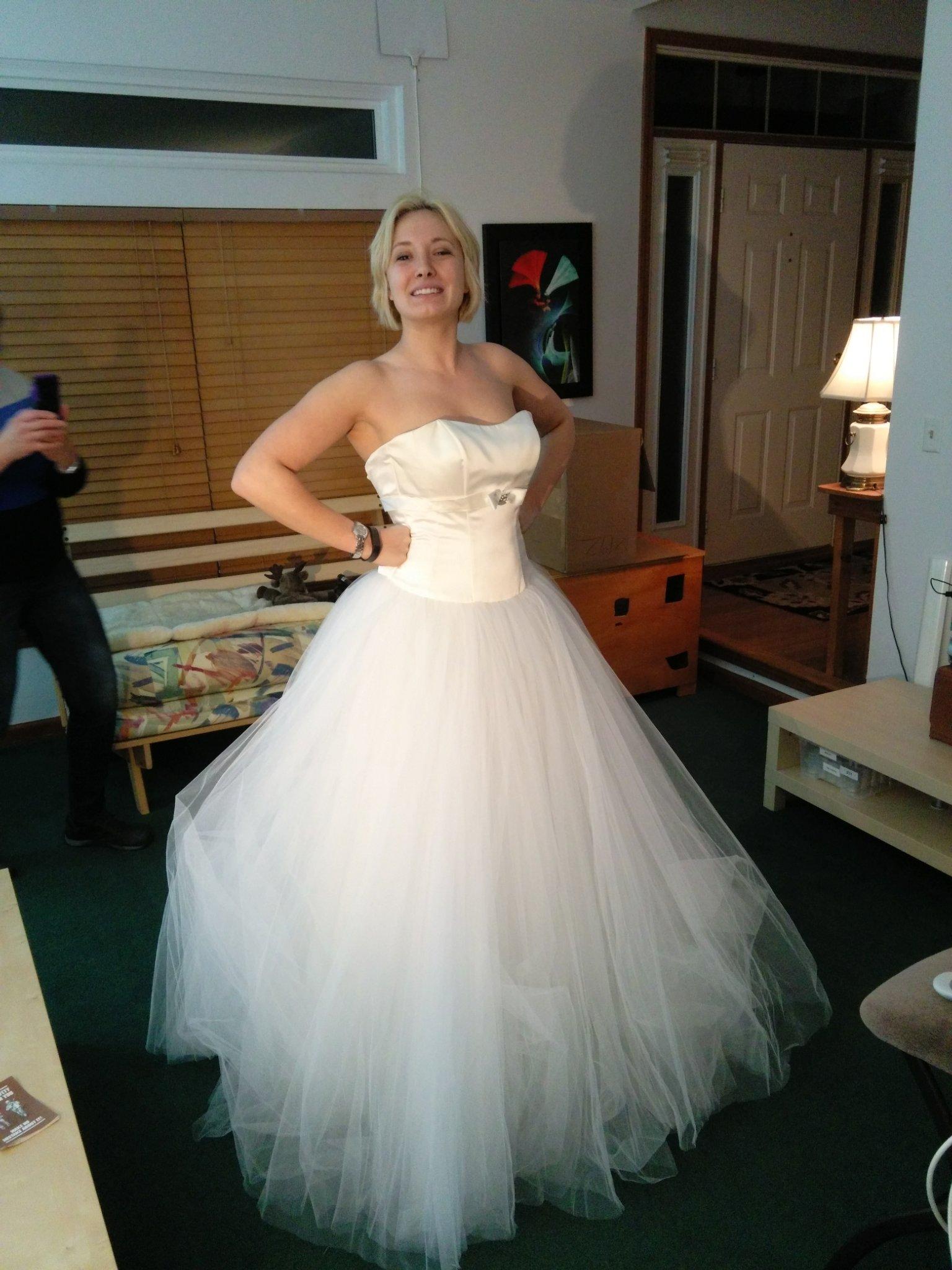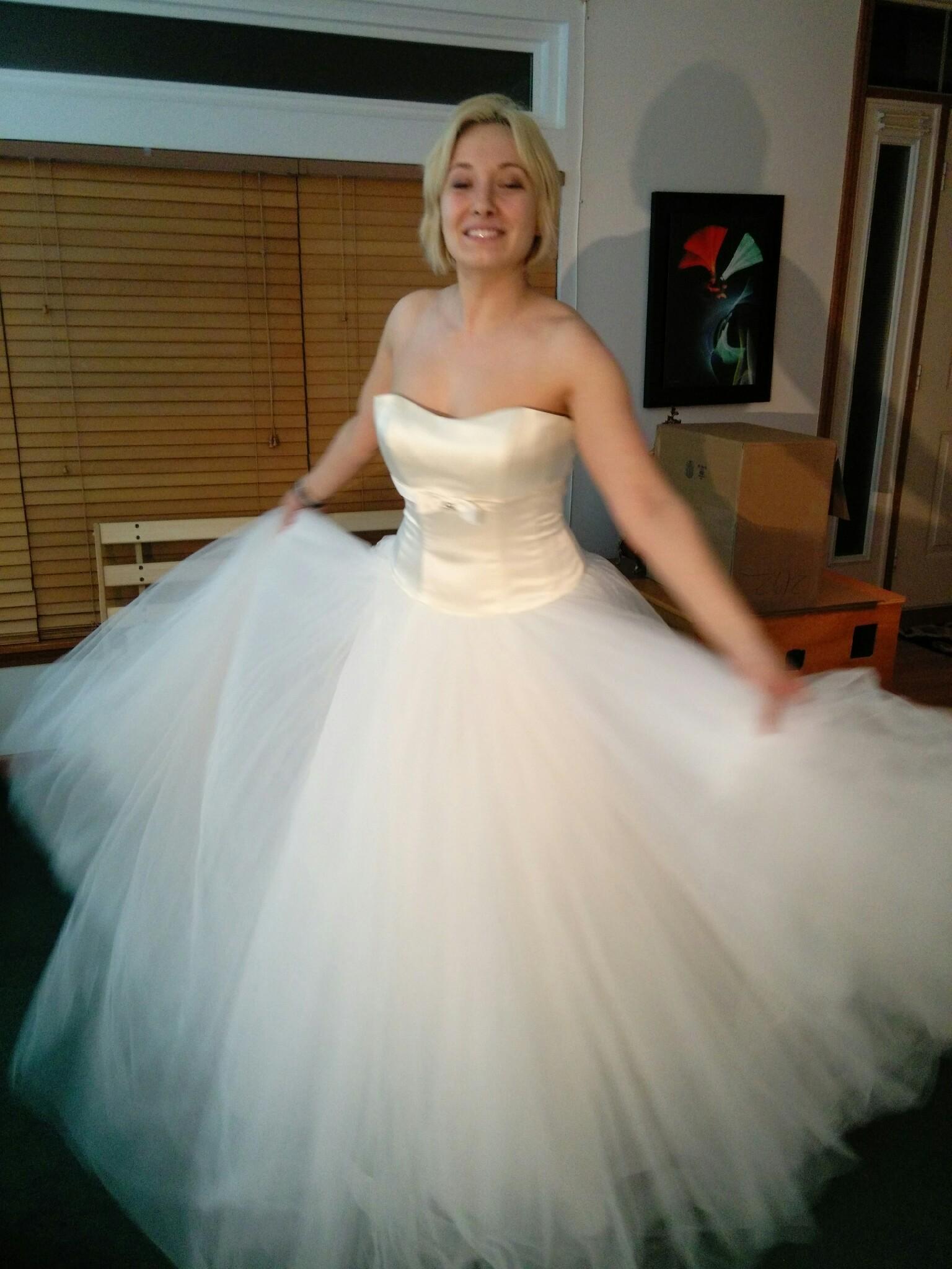 It is an old Priscilla of Boston from 2006, never worn, and was $300! Very happy with this purchase. I had in my mind since I ever thought about wedding dresses that I wanted a big ass tulle Giselle-style ballerina skirt, but floor length, with a simple satin bodice. This is that. I wanted to feel like a ballerina/princess bride.