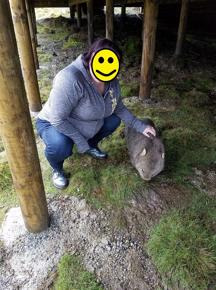 so, a few days later, we're in Tasmania, near Cradle Mountain, getting ready to go back to our cabin before our devil feeding tour. It was around 6/7pm, so not dark yet, but getting close to sunset. We're driving down the road, when all of the sudden, I spot a wombat on the hillside near the road. This is the first one we had seen on the trip, and I was REALLY excited. I yelled for DK to pull over so I could take a picture. He slams on the brakes, and I jump out of the car with my phone, and start off towards the wombat. Like 10 feet from the car, there is a stream - but that wasn't going to stop me, so I jumped over it and started climbing up the hill. The wombat seemed unconcerned, so I got closer and started talking to it. it still didn't seem to be bothered, so i asked if it was going to let me pet it, and carefully reached out and touched it's back. It went on munching on grass, so I went on petting it and talking to it.