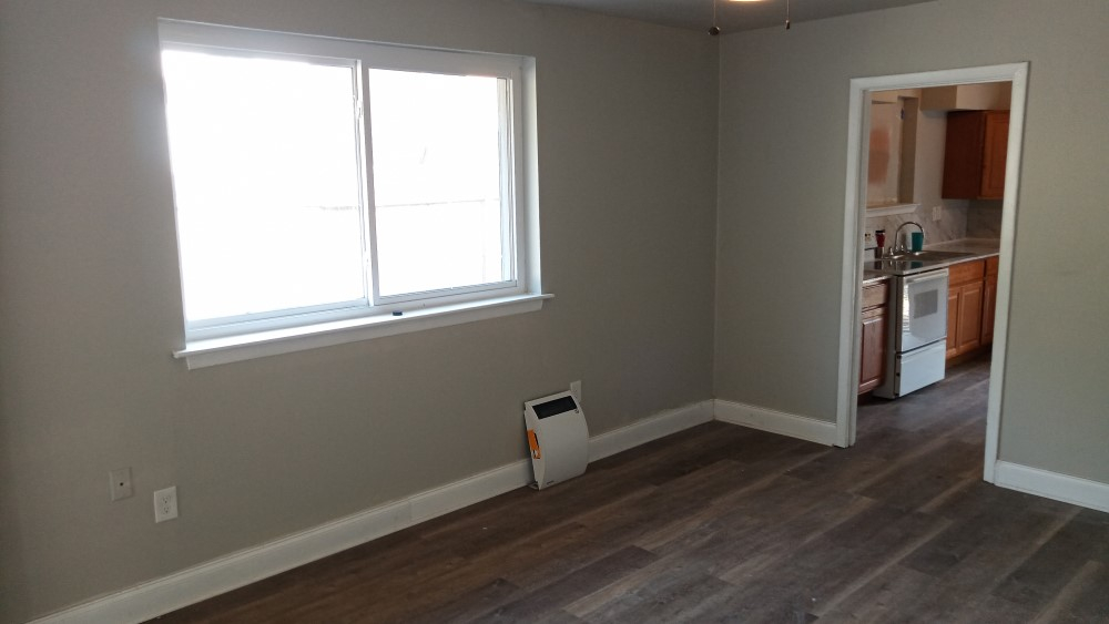 I've posted this next pic before, but here's a refresher.  This is the wood-look LVP flooring we put into all four units of the two duplexes we reno'ed last year.  In our case, we had to replace all the flooring in the house anyway, so it runs continuously from the kitchen to the living room.  But if you're just doing the kitchen flooring, for whatever floor you choose, you'll just want to make sure it has a nice "look and flow" with the flooring it will be next to.