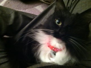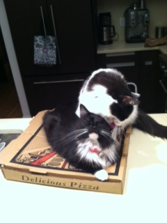 These are Little (white) and Phoenix (black).  They are littermates, now around 5 yrs old.  Phoenix is a one-eyed kitty due to an eye infection she had as a kitten.  We got them from the same rescue group a little after adopting Tigger.  It was so hard to just get one!  They love to groom each other.  Little is a big mush who likes to be held and purrs with a blender-like sound when you pick him up.  Phoenix likes to camp out on your lap.