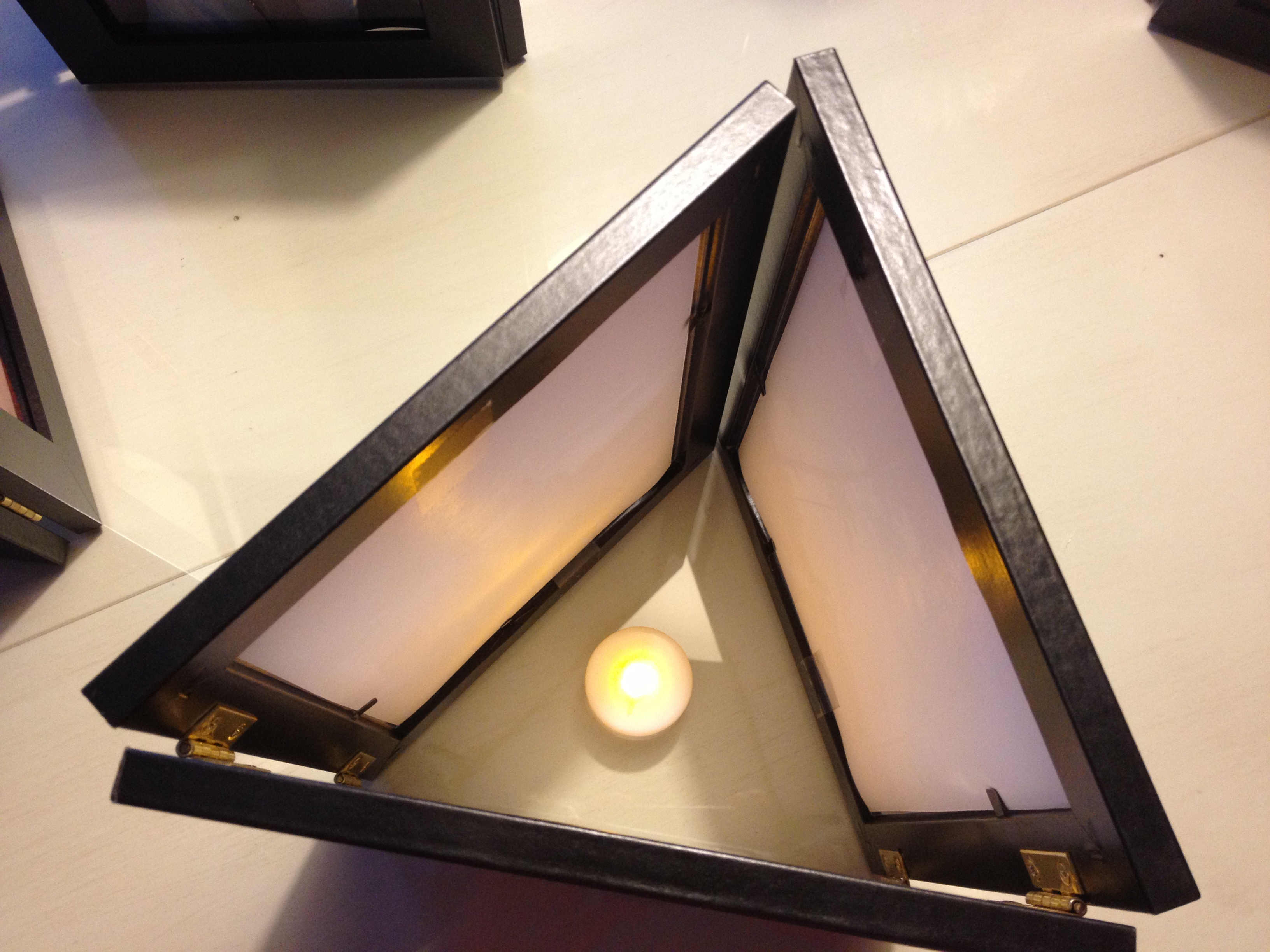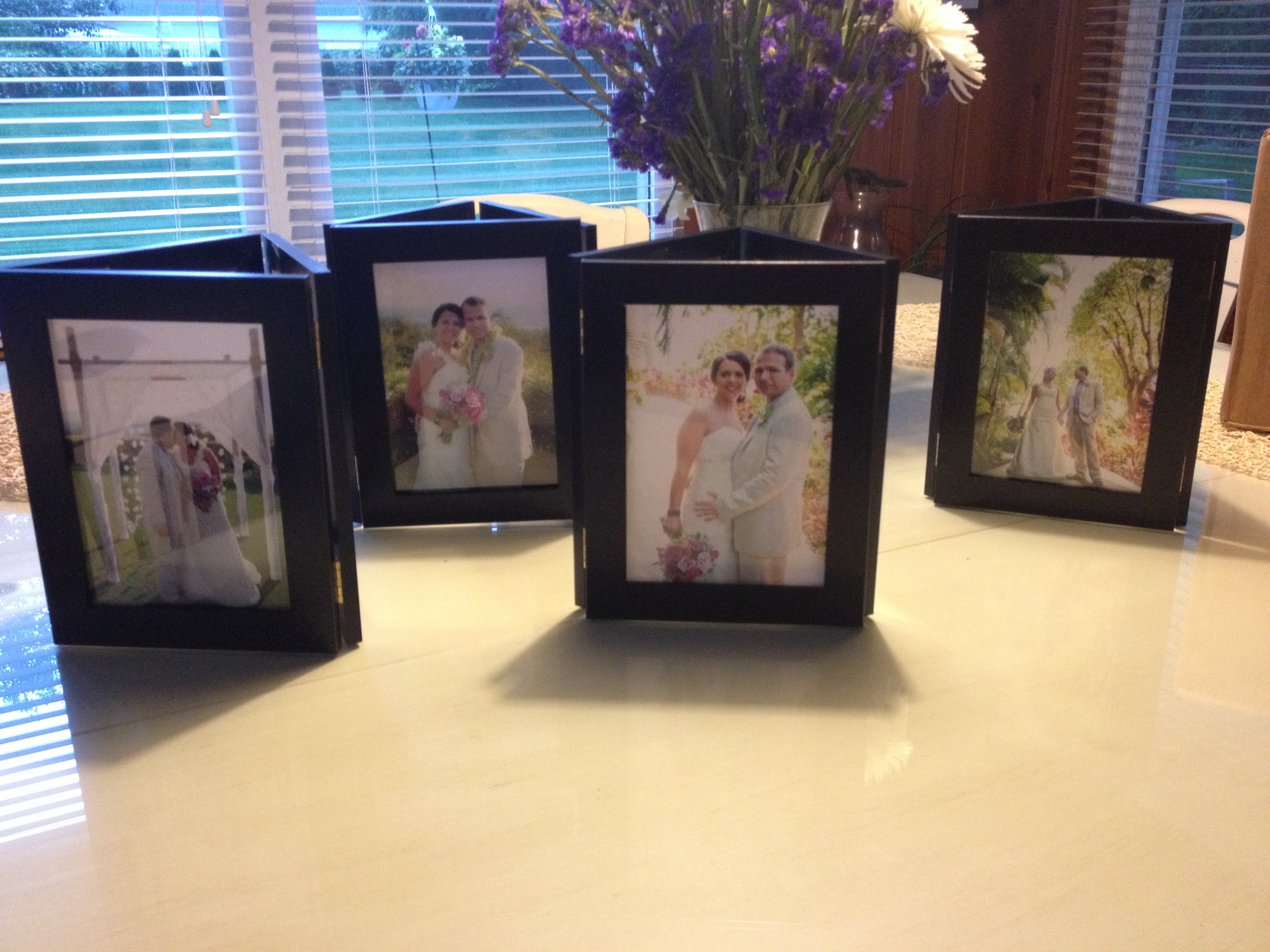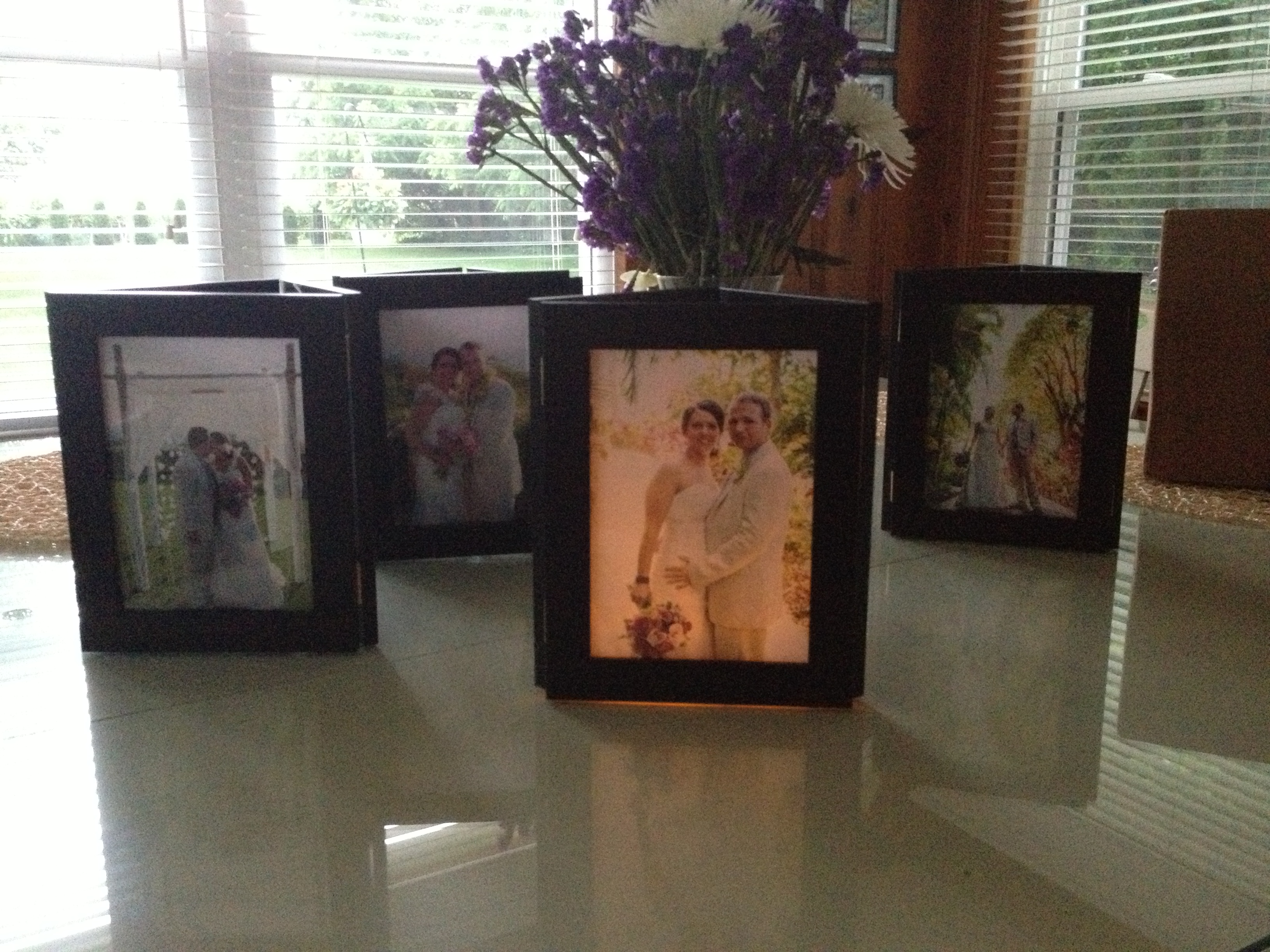 Set of 4 centerpieces that each have 3 (5x7) photo frames. We used these at our at home reception to display photos from our wedding. Put a LED tea light inside of the frames to light them up from the inside. Looked great, everyone loved them!