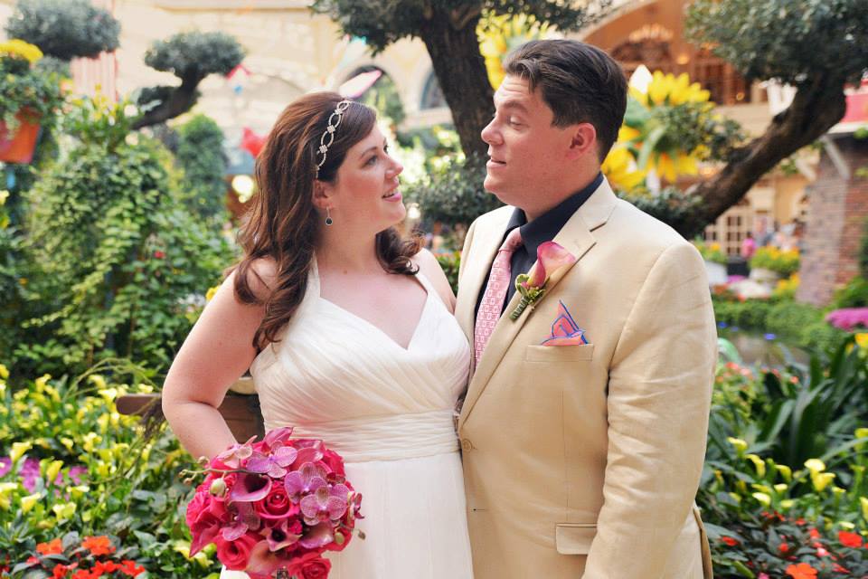 Ok, first, here is a picture of me and my husband. We did photos before the ceremony because we wanted to go directly to the cocktail hour. You can see my bouquet and his boutonnière in this picture, which was taken in the Bellagio's conservatory. Todd does an excellent job at making it look like you guys are the only ones in the very crowded public space.