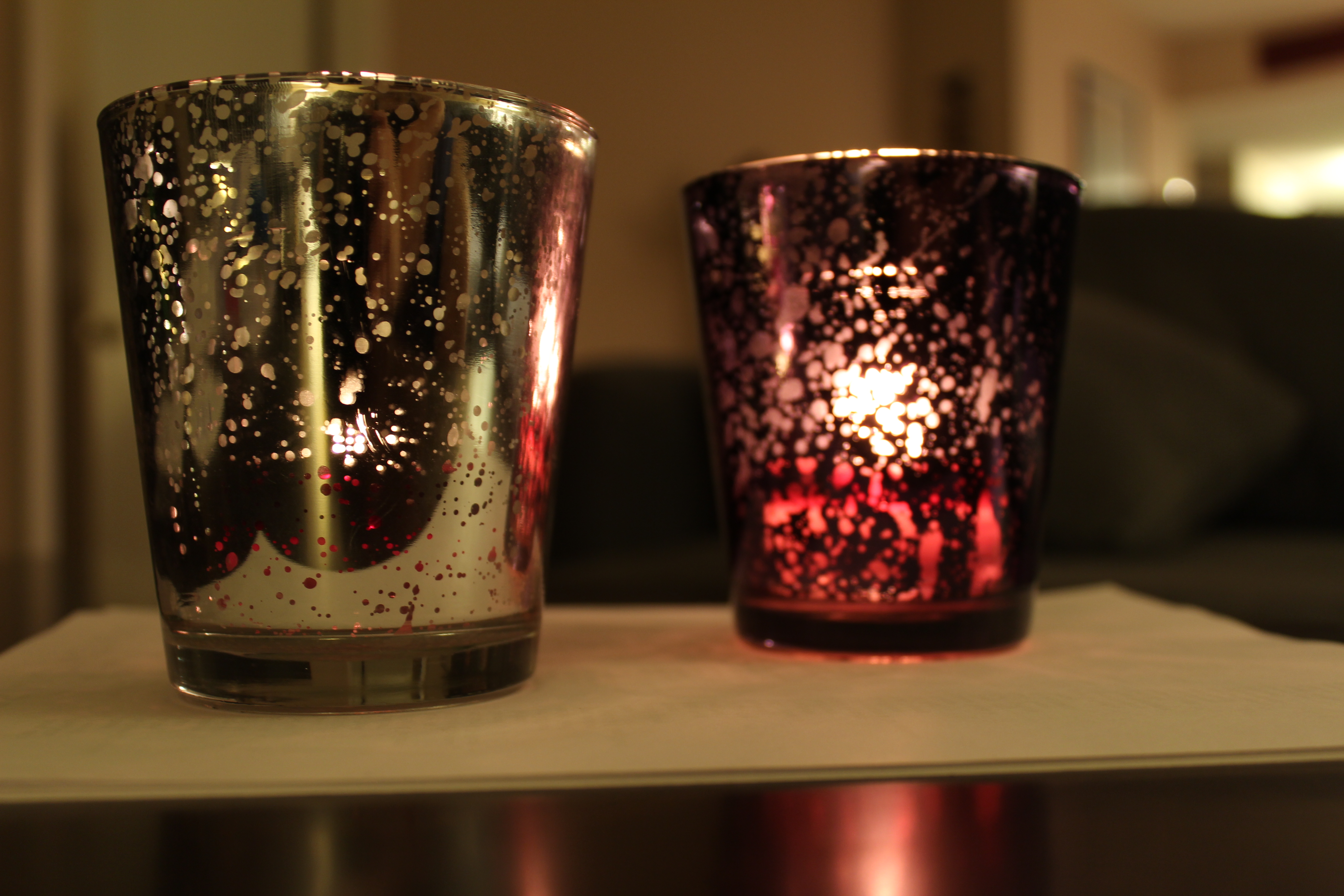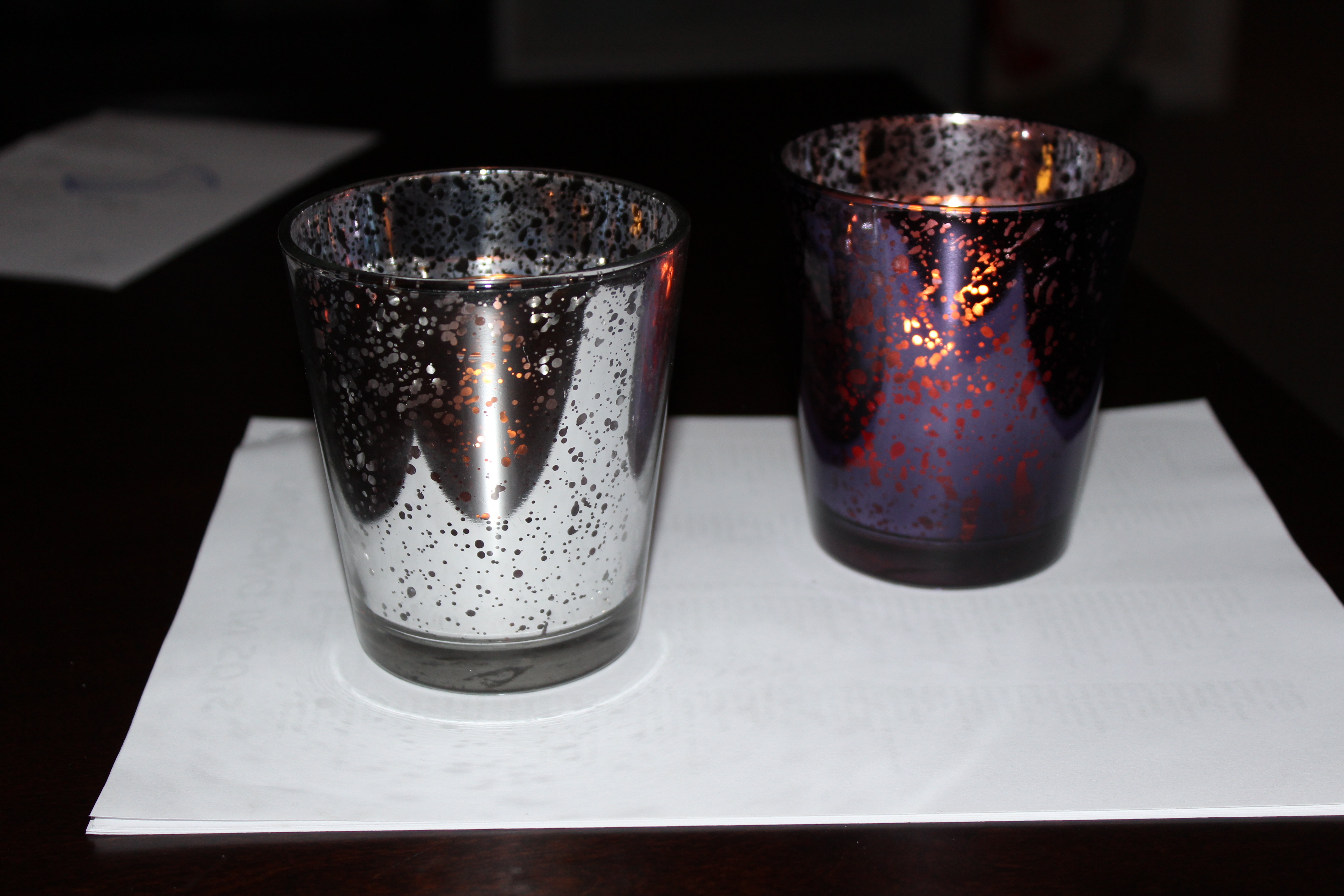 I also have a lot of silver and purple mercury glass votive candle holders. I am using some for candles and some for flowers. They are larger (I think about 4 inches tall and 3 or 4 inches in diameter) and have a smaller glass removable votive cup inside for the candle. These are packed up for the reception, and I don't remember exactly how many of each I have, but I think it is 40 silver, and 30 purple. I will unpack them and confirm that if anyone is interested. I am asking $2.50 each for them. These also will only be used once at the reception.