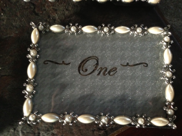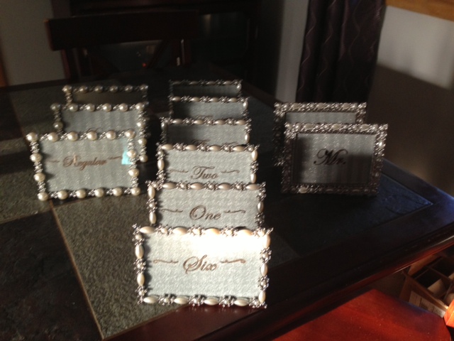 Hi knotties, For Sale from my wedding two weeks ago are 12 pearl and silver accented table number frames, size 5x7. they can be used for anything, table numbers, candy buffet, coffee station, mr. and mrs. signs, etc.