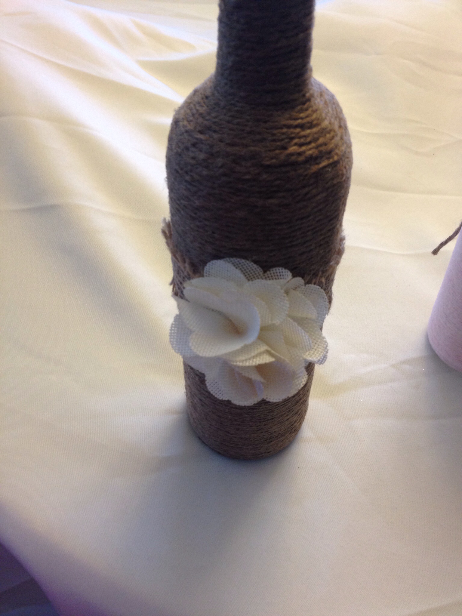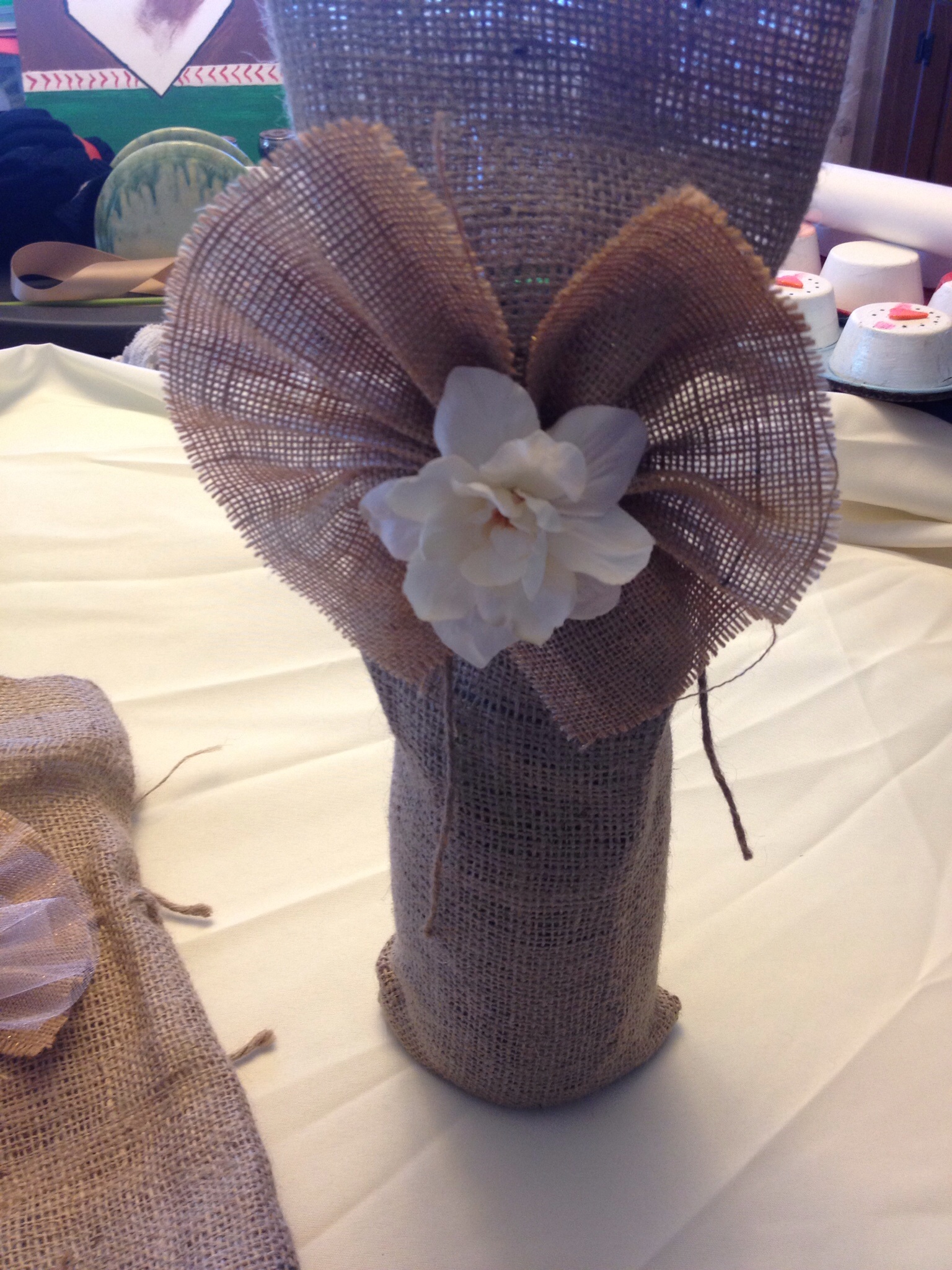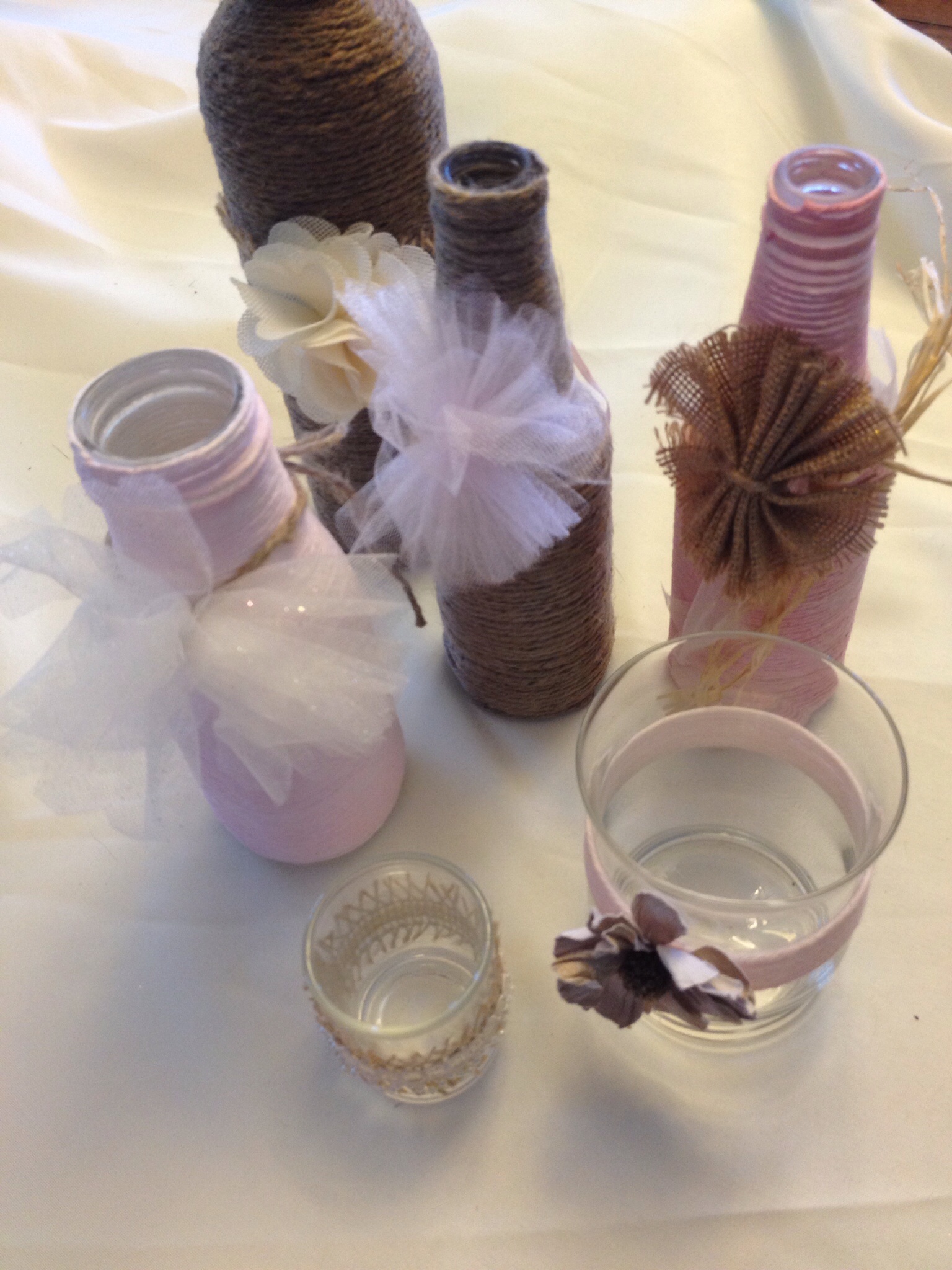Lots and lots of burlap and lace decorated bottles in all shapes and sizes,