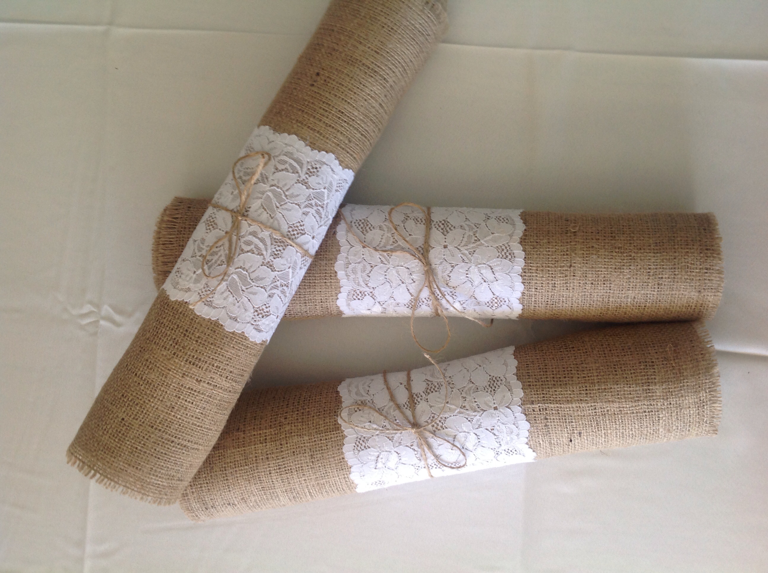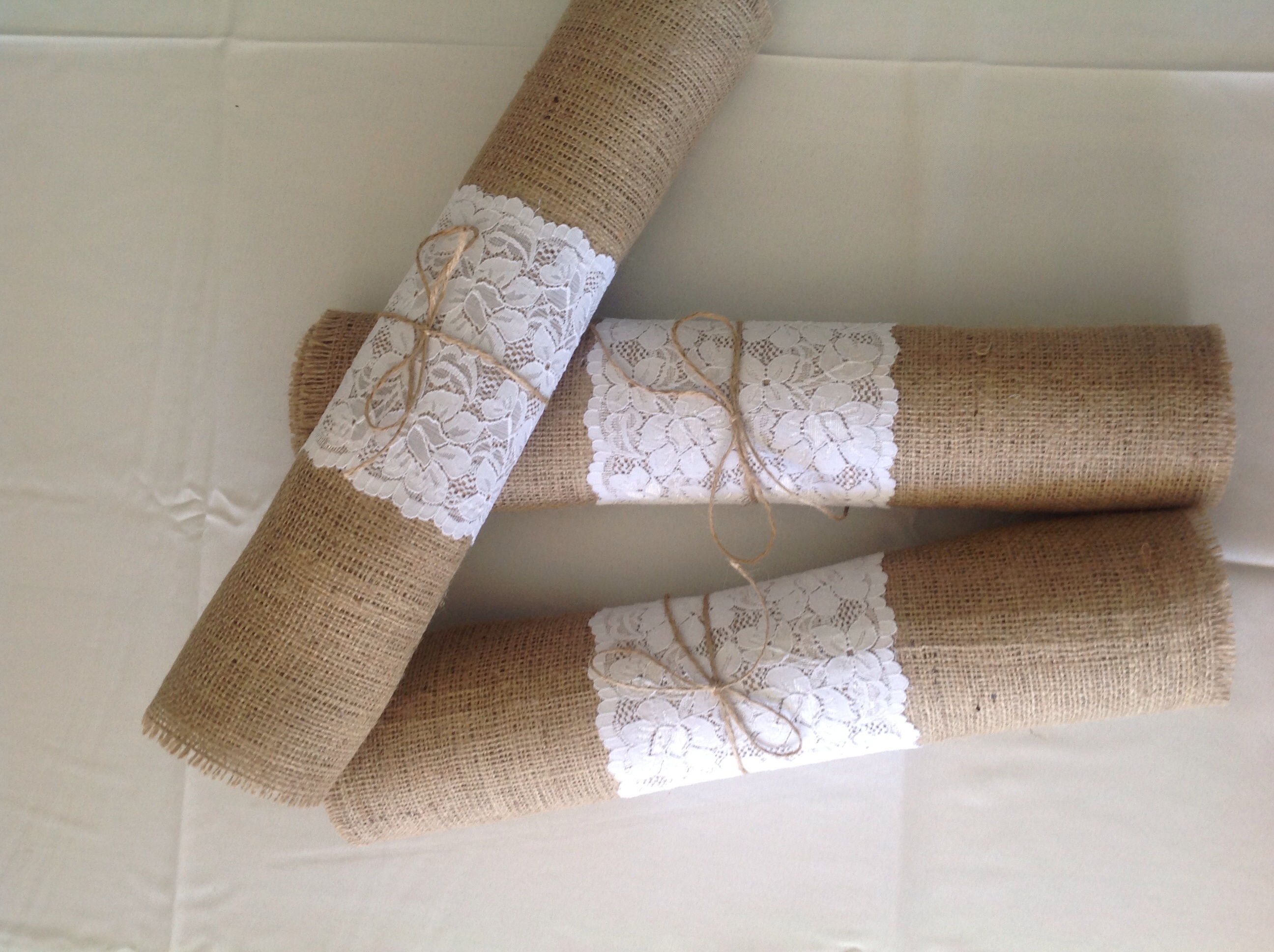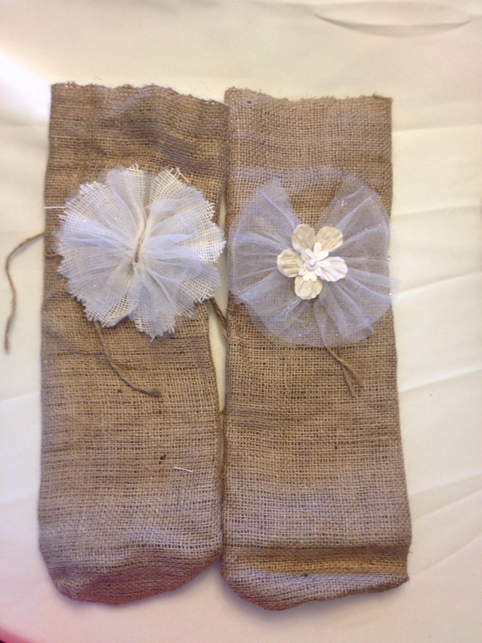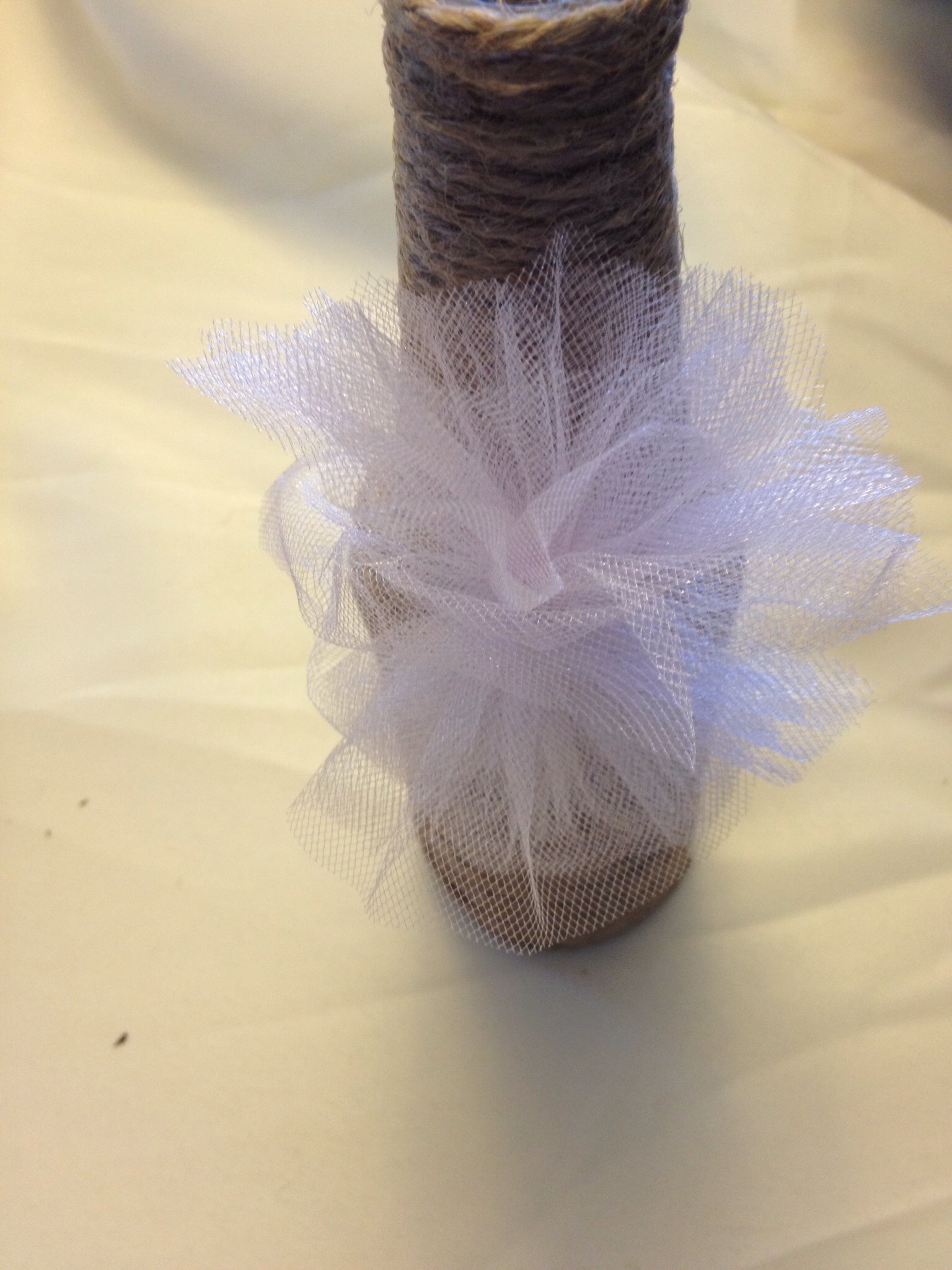 Lots and lots of burlap and lace decorated bottles in all shapes and sizes,