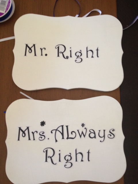 Mr. Right and Mrs. Always Right Chair Signs- $10.00 My grandmother made these for the reception. Super Cute!