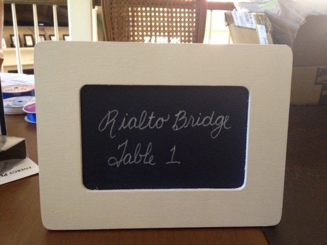 24 White Wooden Frames with blue paper insert- $50 for all. We used these as our table numbers and had different places we had traveled written on blue paper. Peg stand back.