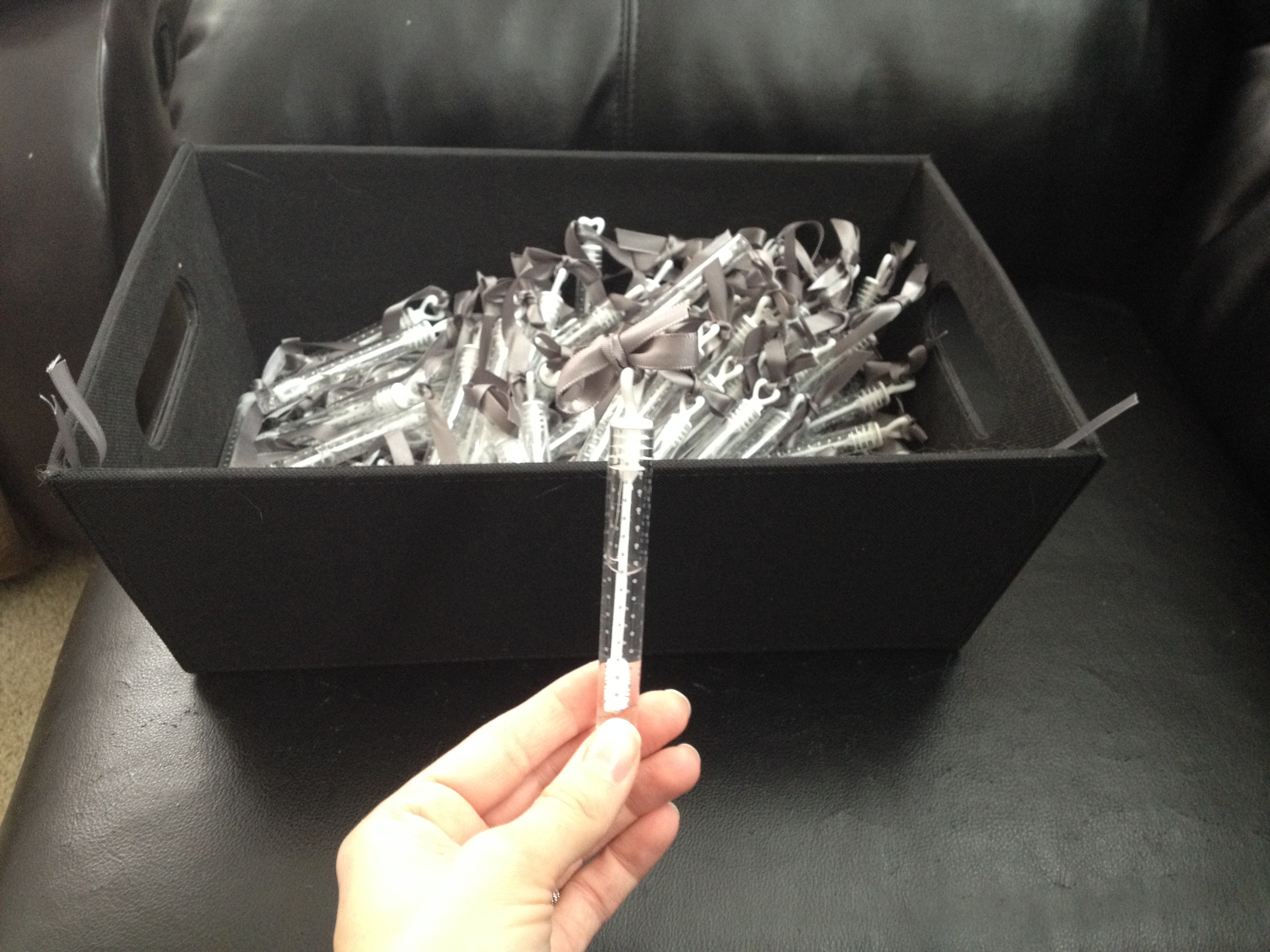 dots, 10 clear/plain. The polka-dot bubble tubes were purchased from The Knot. Most are 1/3 full-they would