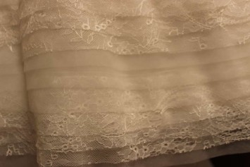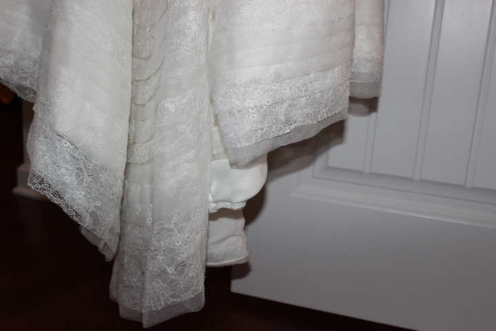 I bought this dress in 2012 for my April 2013 wedding in Charleston, SC. The dress is a trumpet style with tiers of lace and tulle. It comes with a satin bow with three beaded brooches. It was the perfect mix of traditional and modern that I was looking for! The dress is strapless and has a sweep train. The size purchased was size 8 but I had to take it out about an inch to an inch and a half. The neckline and train were not altered. The dress was professionally cleaned and there are no spots or stains. Underneath the train (not visible to the eye), you can see a small area where the fabric is "picked" but there is no significant damage. This dress could be shipped or delivered if the area is near Charleston, SC or Raleigh, NC. Let me know if you have any questions!