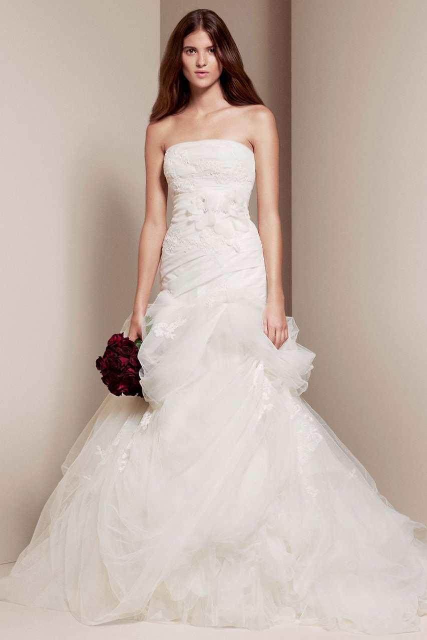 Exquisite fit to flare White by Vera Wang gown made up of organza and tulle with taffeta bouquets and lace appliques placed on a diagonally draped bodice. The gown features a unique single-breasted design with zipper closure at the back with a sweep train 60″ from the natural waist. This gown is absolutely breathtaking and can make any figure look impeccable. My finance and I have decided on a destination beach wedding otherwise I would not be getting rid of it. Perfect for a winery/garden/church wedding. If you’d like to see me more pictures, please inquire. Only serious inquiries please.