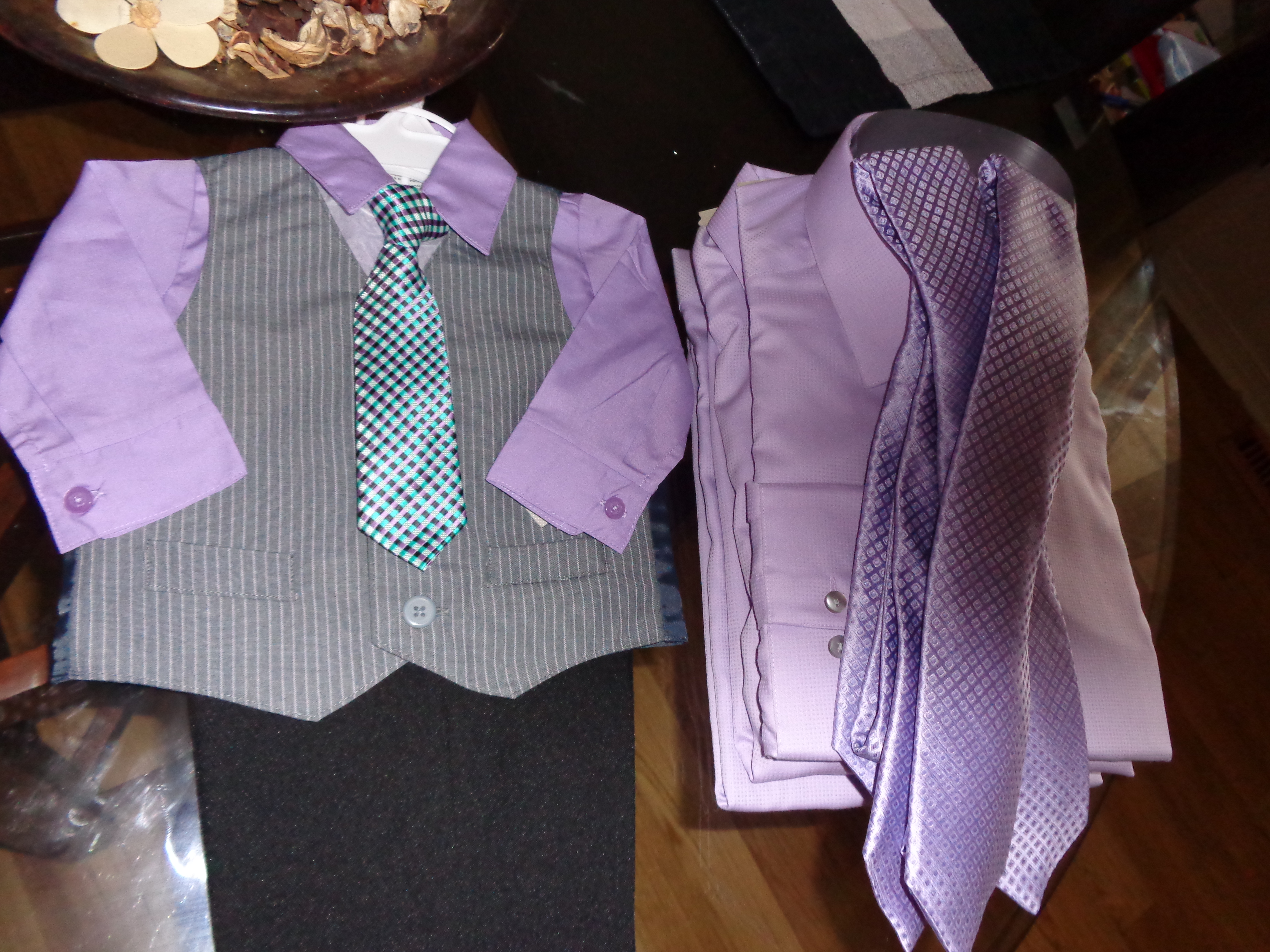So excited to have found these beauties on sale! Our son will be wearing this outfit with a black jacket and probably a darker purple tie, and the guys will all be wearing the lavender shirts and ties with charcoal grey vests and jackets. Each item was 40% off, and the shirts were over 50% off!