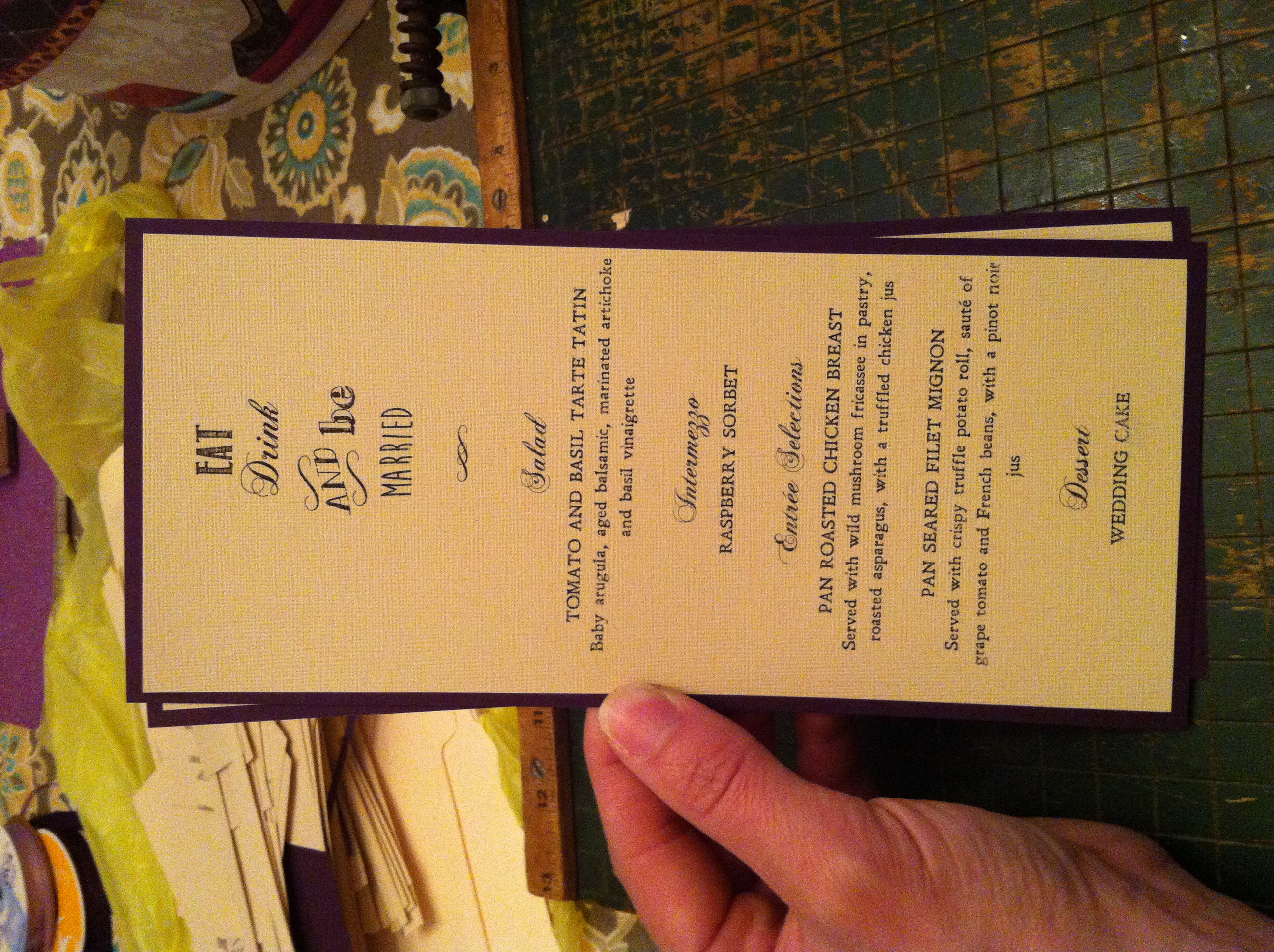 Our colors are gray and purple (girls in gray dresses/groomsmen with gray vests/ties, flowers are purple) Centerpieces are ivory colored lanter with ivory pillar candle in it ( http://www.pier1.com/Medium-Jeweled-Lantern---White/2755761,default,pd.html?cgid=lantern#start=1) with small cube vases with purple hydrangeas on either side of lantern. I've already printed menu's on an ivory paper mounted on a dark purple. I was going to do the gray table clothes (it's a light gray) with white napkins...but will that look okay with the ivory lanterns/menus? The menus will be folded like a pocket with the menu's placed in the pocket.