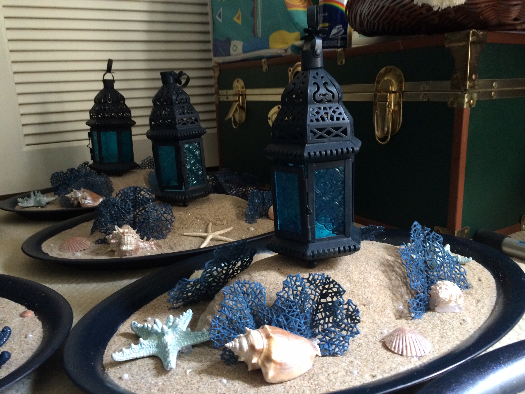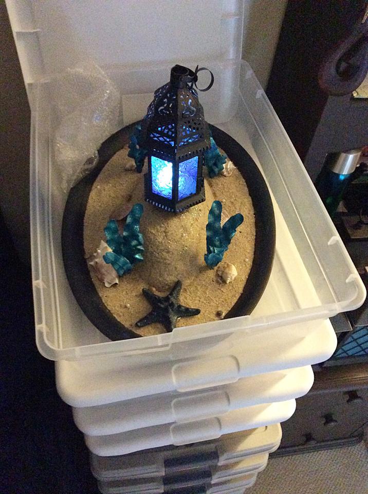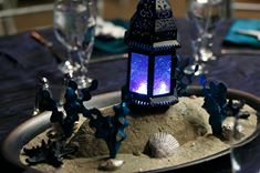 20x14 inch Navy Blue Tray with fixed sand/ faux coral/shells/pearls and a removable blue Moroccan lantern with white LED Light