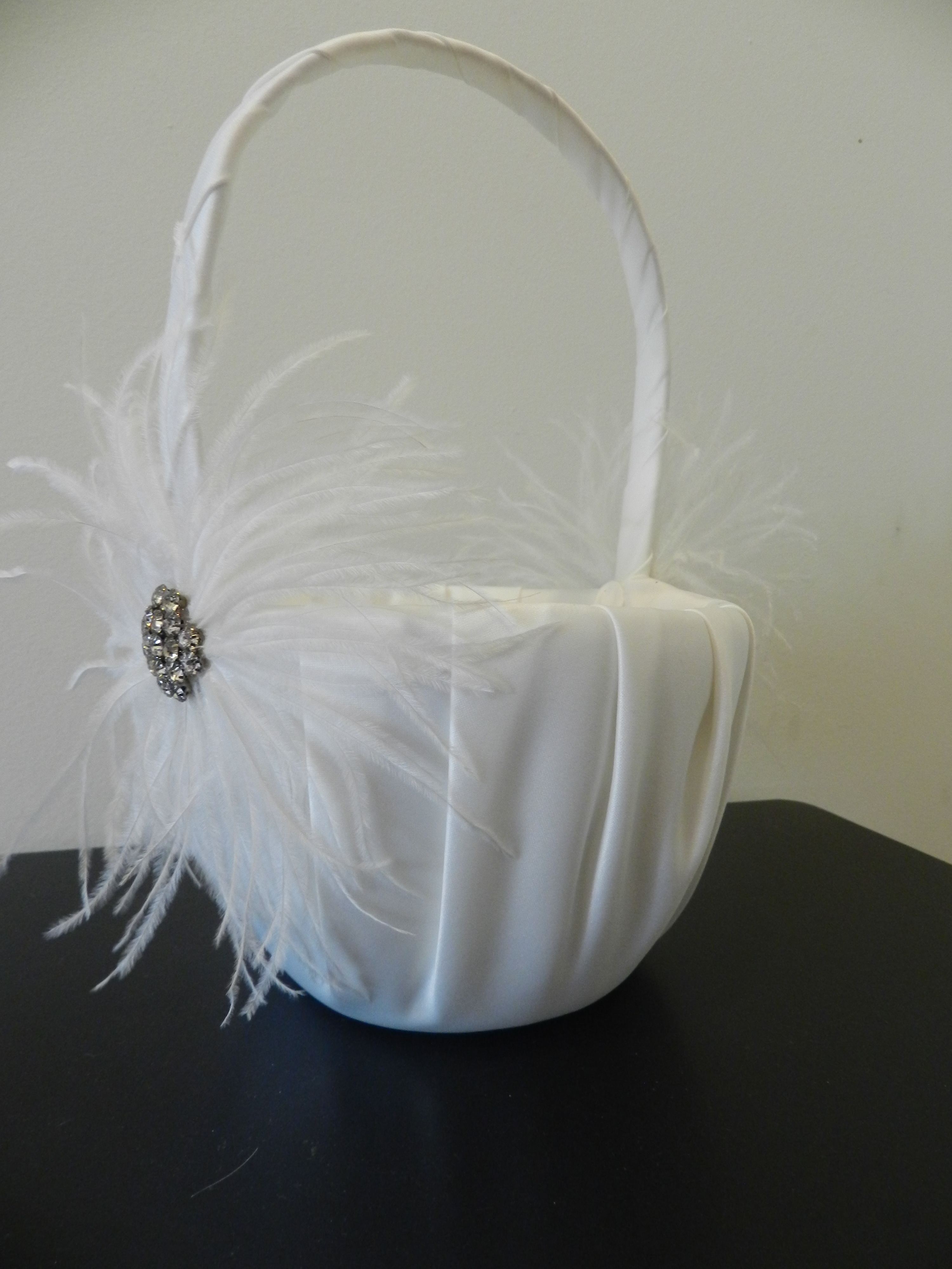 5. Flower Girl Basket - Didn't match my flower girl's dress and can't return it. Has only been out of the box for the picture. Has a feather applique on each side. $12